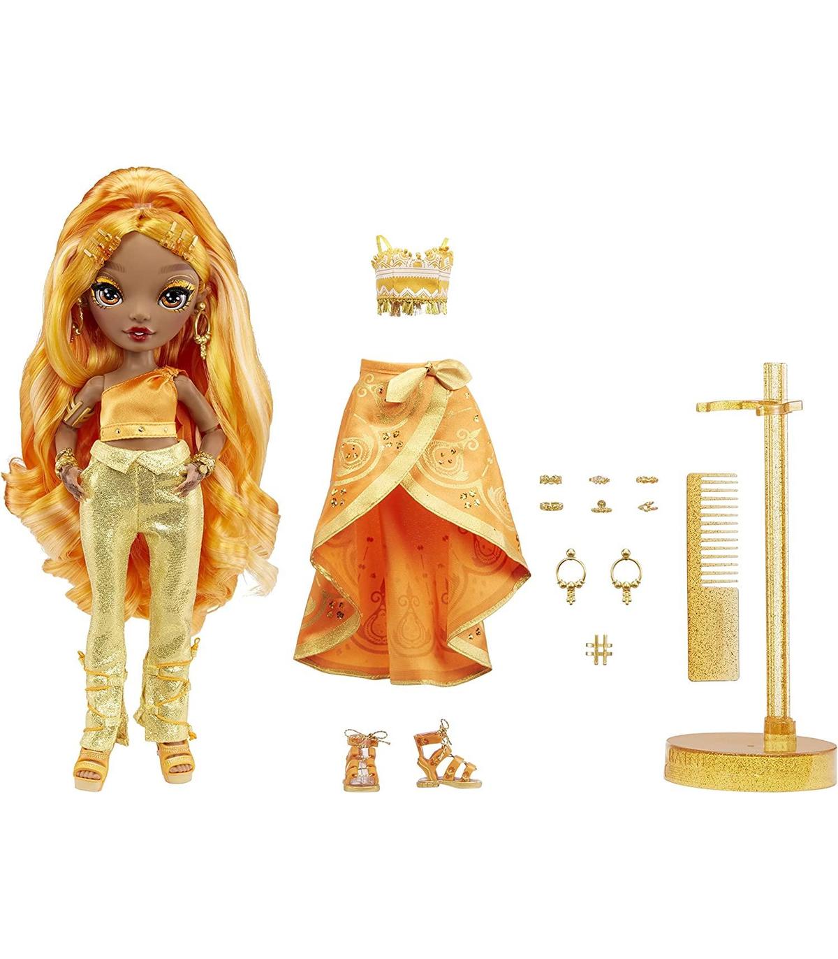 CARACTERÍSTICAS - Meena Fleur tiene un diseño único y está completamente vestida de color DORADO. Su ropa está llena de detalles, tiene un hermoso pelo rizado y ojos de cristal con pestañas largas. Colecciona el arcoiris con Rainbow High
