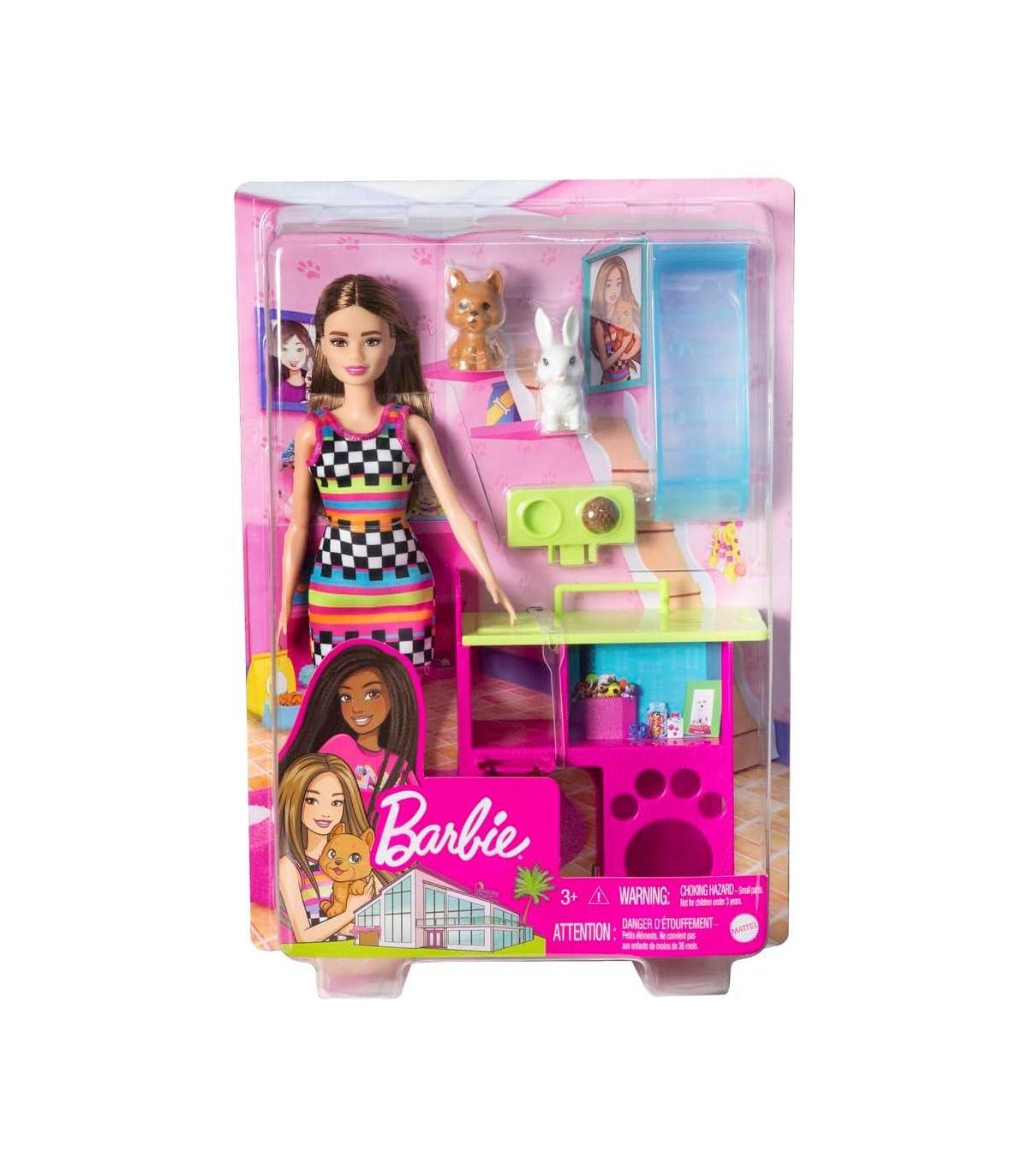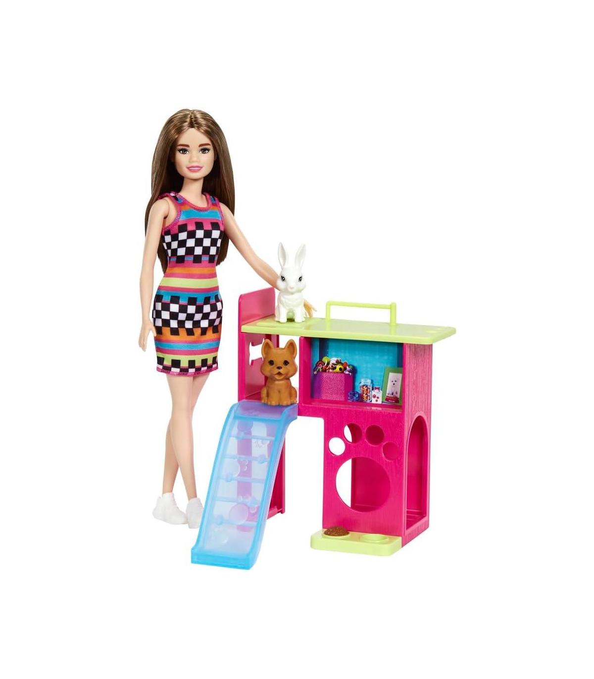 Barbie Muñeca Con Mascotas Pásalo en grande jugando con las mascotas con este conjunto de juego de Barbie que incluye a la muñeca Barbie®, a su cachorro y a su conejito. ¡También trae su propia casa de juegos! La casa de juegos tiene un diseño colorido y llamativo, varios pisos y espacio para que las dos mascotas puedan comer, dormir y jugar. Sus divertidas características, como los escondites y el tobogán azul translúcido, inspiran historias adorables. La muñeca Barbie está lista para jugar durante todo el día con un vestido colorido y unas zapatillas informales y chulísimas. Edad recomendada: +3 años
