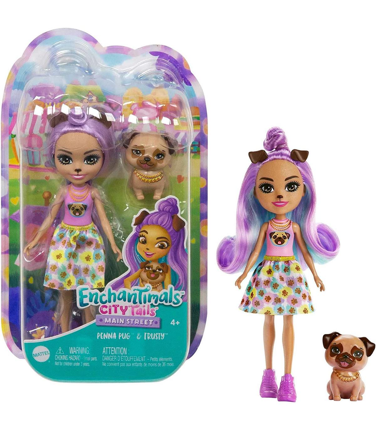Enchantimals City Tails Penna Pug ¡Descubre a las Enchantimals! Estas muñecas dan vida al grupo adorable de amigas acompañadas de sus inseparables mascotas, a las que cuidan y miman, ya que son sus mejores amigas. La muñeca Penna Pug viene con la figura de Trusty. Siempre están juntos y, ¡hasta se parecen! Como le encanta juguetear con la moda, la muñeca Penna Pug (15,2 cm) lleva unas orejas de perrito flexibles, una falda y unos zapatos intercambiables. Ella y Trusty incluyen un montón de detalles de fantasía para mostrar al mundo que son los mejores amigos. El conjunto de la pequeña muñeca y la figura son un gran regalo para niños y niñas a partir de 4 años.