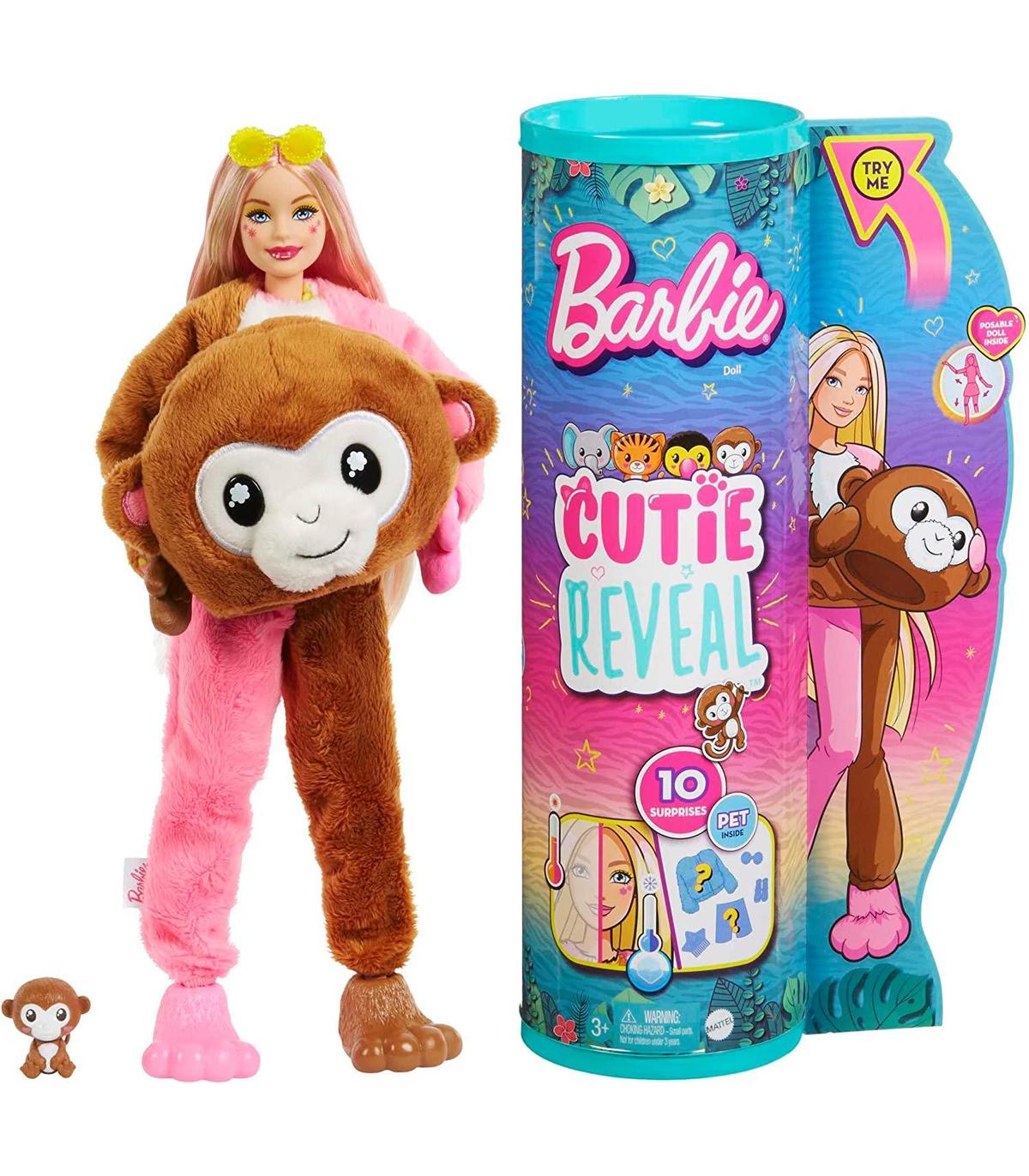 Abre la caja y verás en su interior un descarado mono de peluche que oculta una muñeca Barbie bajo el disfraz. ¿Qué muñeca te tocará?