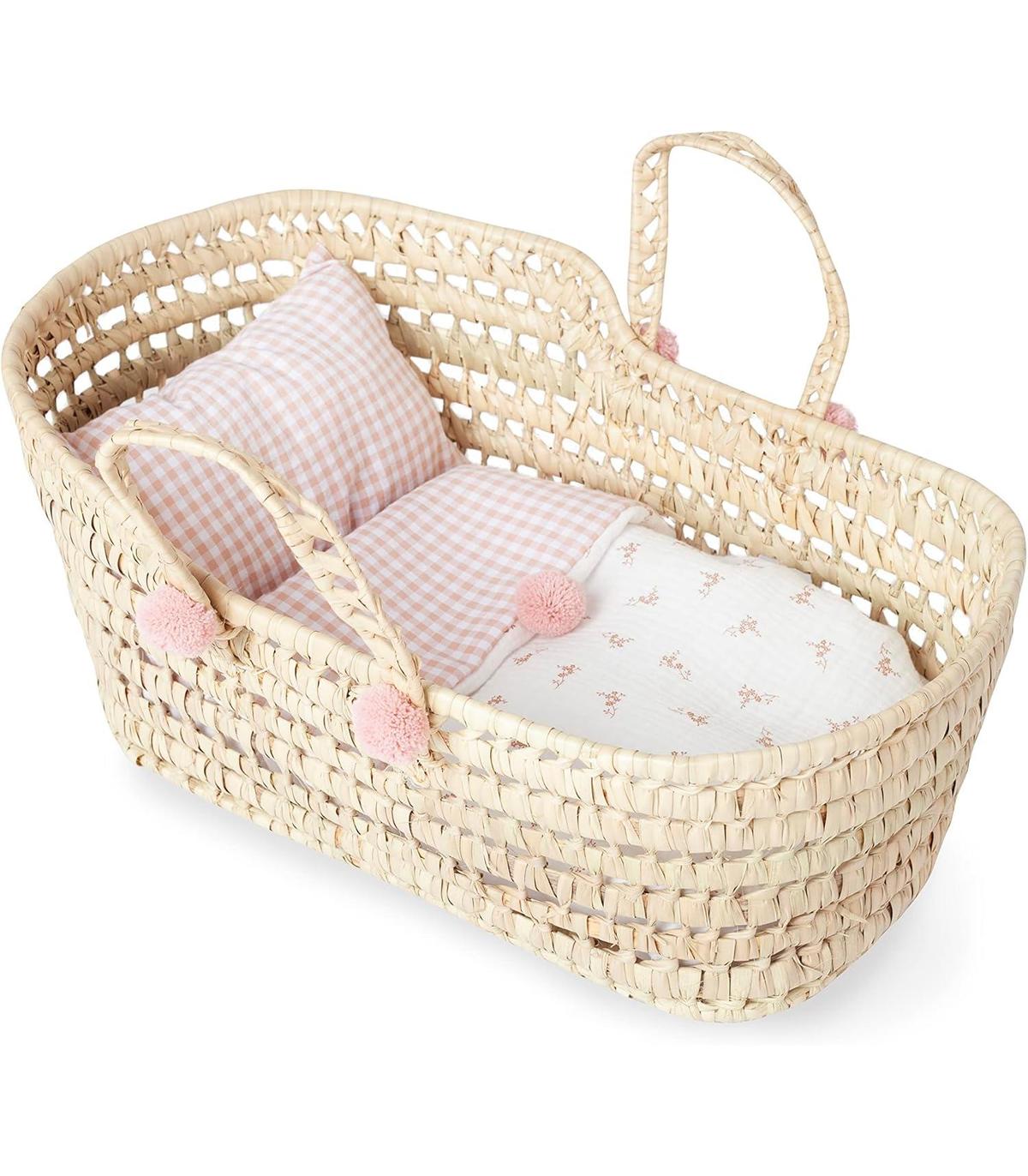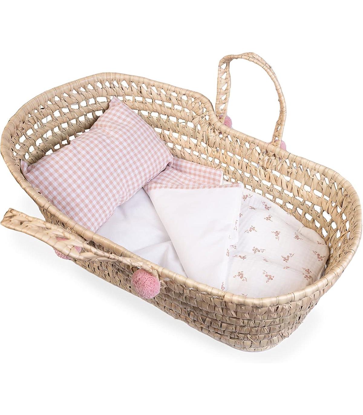 Juega, pasea, disfruta, duerme a tu muñeca en el capazo de palma de flores y vichy de Muñecas Antonio Juan. Para muñecas de hasta 42 cm.