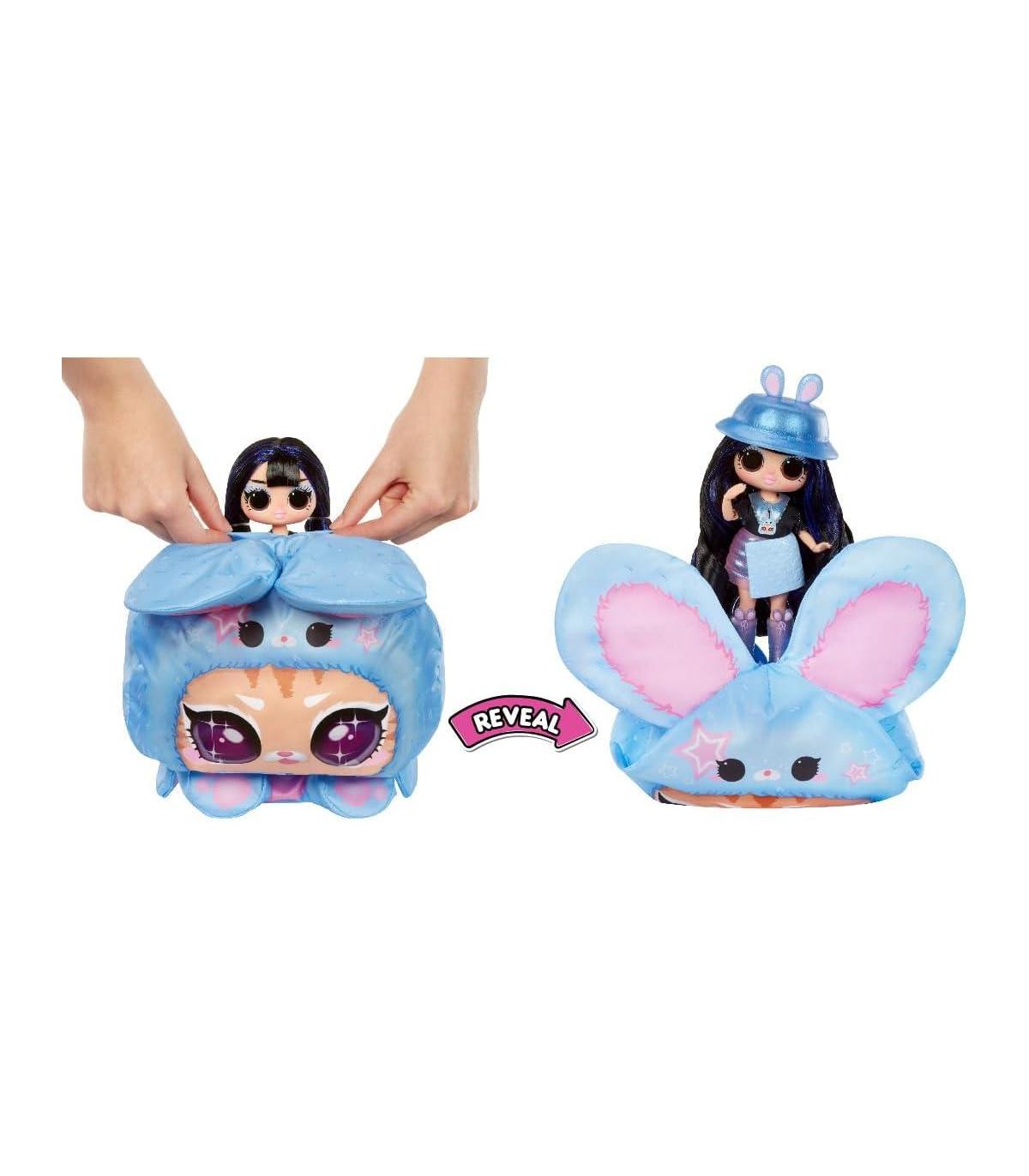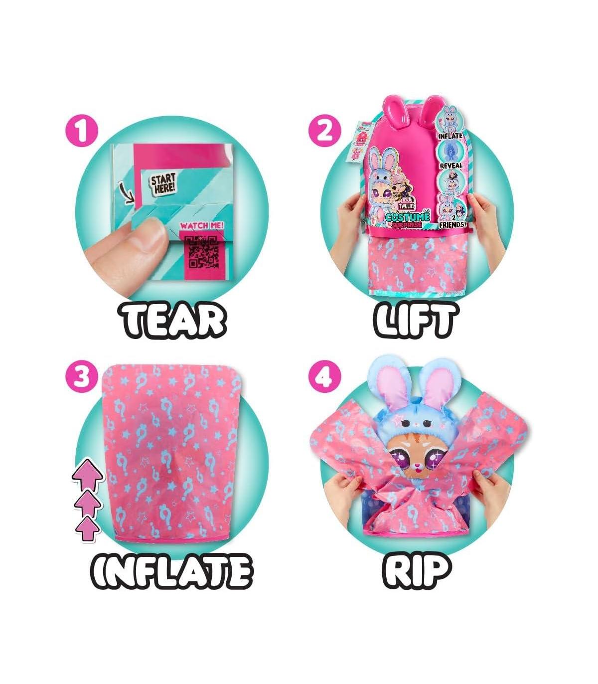 Extravagantemente divertido con capas de sorpresas: Primero rasga la cremallera en la parte inferior del embalaje y levanta la carcasa rosa exterior para revelar un misterioso papel de regalo. Mira cómo el papel se vuelve más grande y lleno y una vez completamente inflado, abre el papel para descubrir tu encantador disfraz de conejo azul. ¡Pero espera, la sorpresa no se detiene ahí! Deshaz el velcro de la parte posterior de la cabeza del conejito para descubrir tu hermosa muñeca Tweens Aya Cherry escondida en el interior