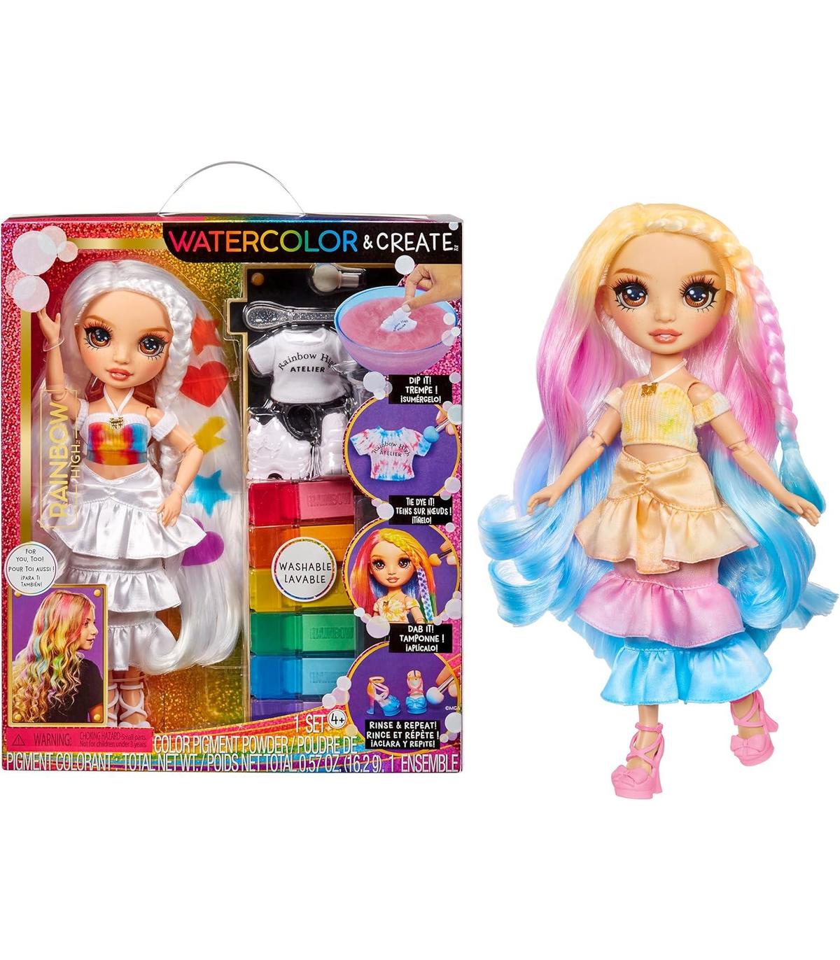 Rainbow High Muñeca Watercolor & Create MÓJALOS: Sólo tienes que añadir agua a los 6 polvos de colores del arco iris para crear acuarelas y después mojar la ropa y el pelo; incluye 6 colores (rosa, naranja, amarillo, verde, azul y morado) para hacer muchos diseños coloridos. Es muy fácil APLÍCALOS: Para conseguir diseños precisos, aplica la esponja de doble punta en las acuarelas y luego directamente sobre la ropa y el pelo. ¡Hay muchas maneras de jugar! KIT DE TINTE + PLANTILLAS: Incluye gomas elásticas para crear divertidos diseños tintados: espirales, “scrunch” y mucho más. Las plantillas permiten crear formas divertidas en el pelo y la ropa ROPA ADICIONAL: Además del conjunto totalmente blanco (top de color blanco, falda blanca con volantes y tacones blancos) con el que viene la muñeca, incluye una camiseta y unas zapatillas extra ENJUAGA Y REPITE: Fácil de hacer una y otra vez. Sólo tienes que lavar con agua y jabón, dejar que todo se seque, y empezar a crear de nuevo TAMBIÉN PARA TI: Acuarela también para tu pelo. Sólo tienes que mojar o dar toques para añadir color a tu cabello. Nota: el color será más intenso en cabellos claros BONITOS RASGOS: La muñeca Watercolour & Create tiene un precioso pelo largo con rizos y una trenza corta en la parte superior, pestañas largas y ojos de cristal. Colecciona el Arco Iris de todas las muñecas Waterc