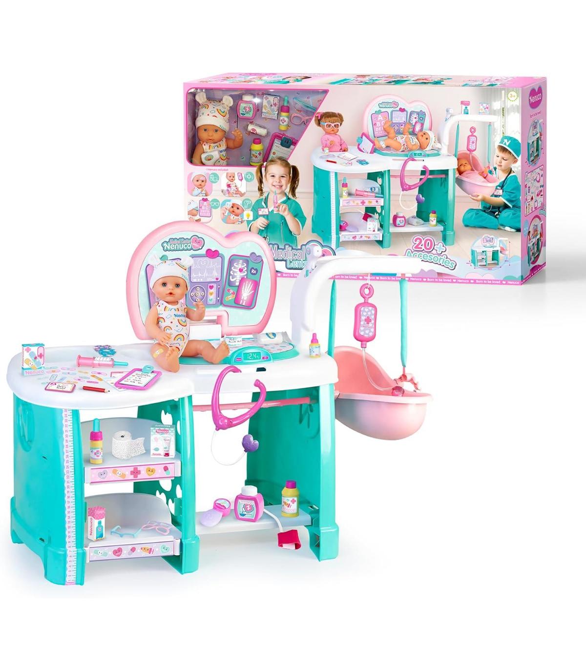 Equipado con más de 20 accesorios detallados y realistas, como un termómetro que se ilumina, un estetoscopio para escuchar el corazón, y vendas para sus heridas, este centro médico tiene todo lo necesario para cuidar del bebé.