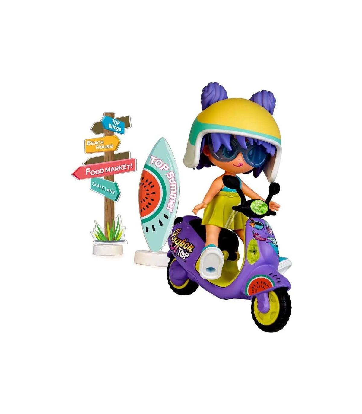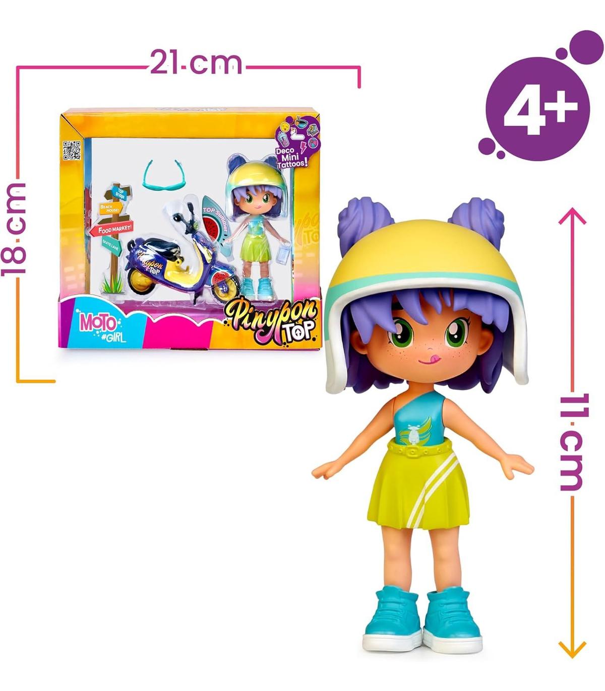Pinypon Top Moto Girl Este set incluye una figura articulada con doble cara y un look moderno, lista para disfrutar del verano. Con su ropa y zapatos intercambiables, puedes personalizarla para cada ocasión y crear diferentes combinaciones llenas de estilo La figura viene equipada con unas gafas y un casco, ideales para completar su atuendo y prepararla para montar en la moto incluida. Estos accesorios añaden realismo y diversión al juego imaginativo El set incluye elementos de cartón que te permiten montar tu propio escenario veraniego, perfecto para hacer que tu chica Pinypon viva aventuras emocionantes bajo el sol. La creatividad no tiene límites Incluye mini tatuajes que puedes usar para decorar a tu figura Pinypon y añadirle un toque único y personalizado. Dale vida a tu imaginación creando un estilo exclusivo para tu chica TOP Con brazos y piernas articulados, la figura Pinypon se adapta a diferentes poses, ofreciendo horas de diversión interactiva. Además, es perfecta para combinar con otros sets Pinypon y ampliar tu colección