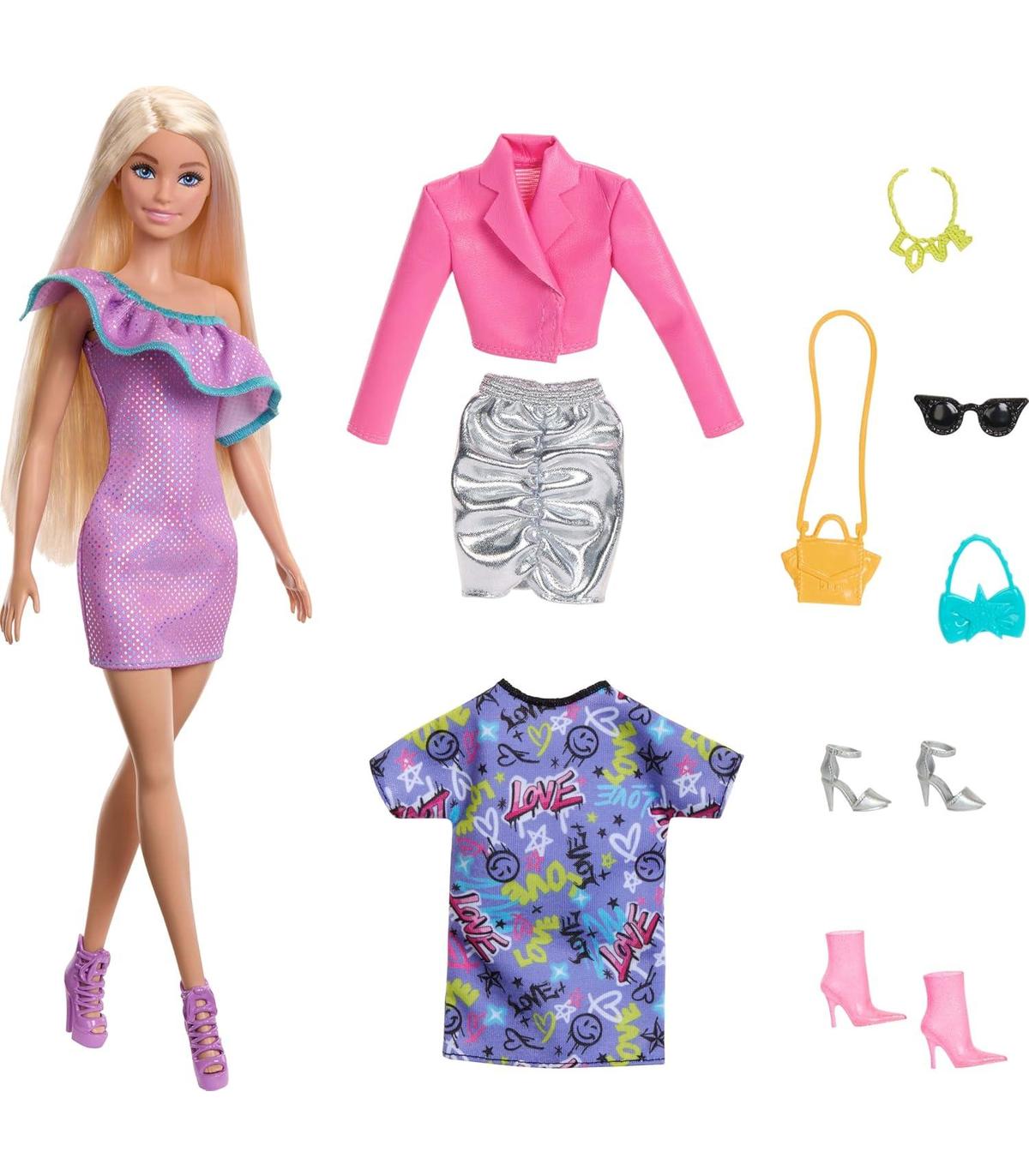 ESTA MUÑECA BARBIE EXTRA incluye un bonito top con estampado floral, además de 15 accesorios de moda y prendas, como un poncho transparente de flores y botines blancos.