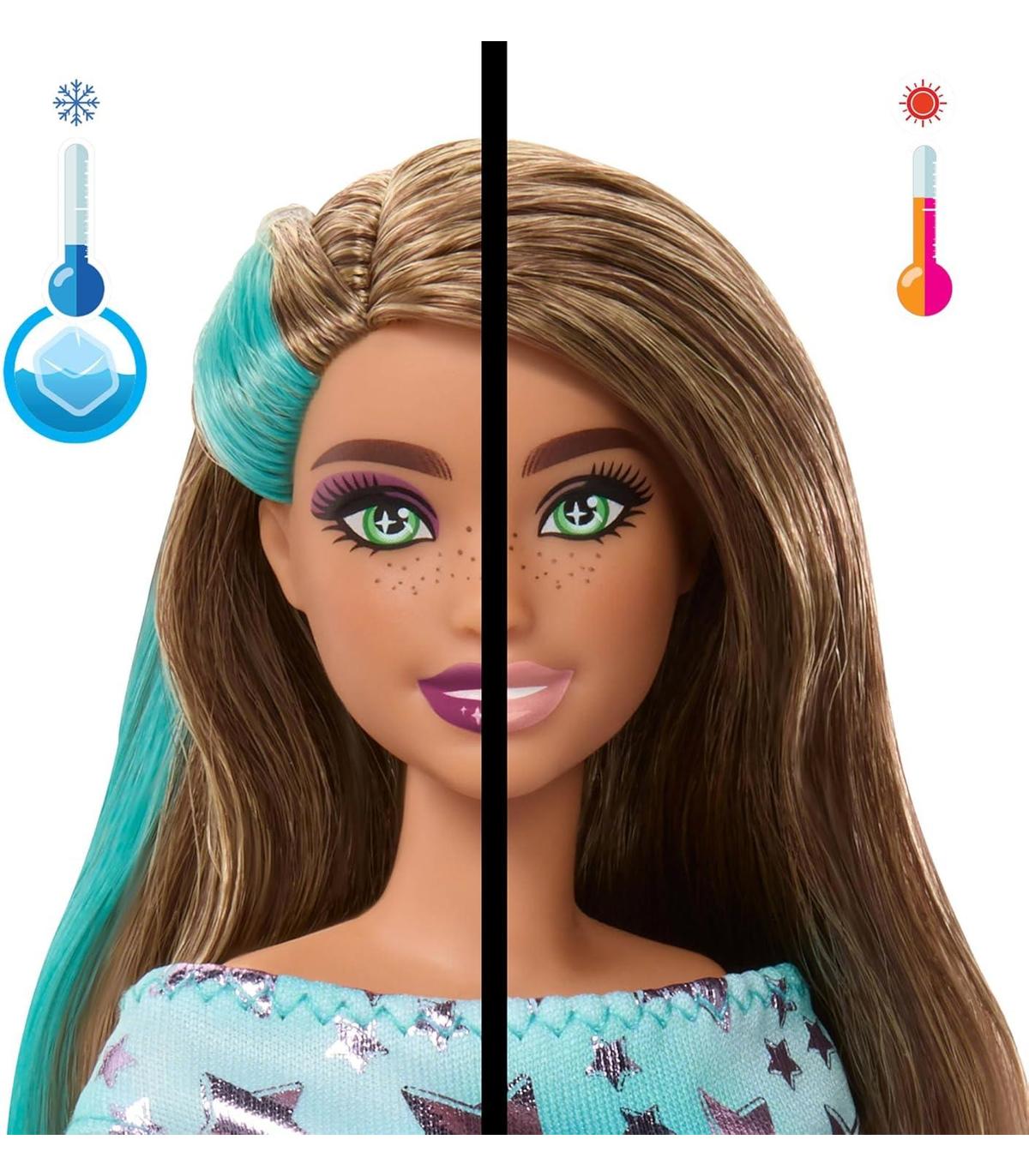 La diversión continúa con la transformación del cambio de color. Utiliza agua helada y tibia para transformar la cara de la muñeca Barbie con detalles brillantes de fiesta y “abrir” y “cerrar” los ojos de la minimascota una y otra vez.