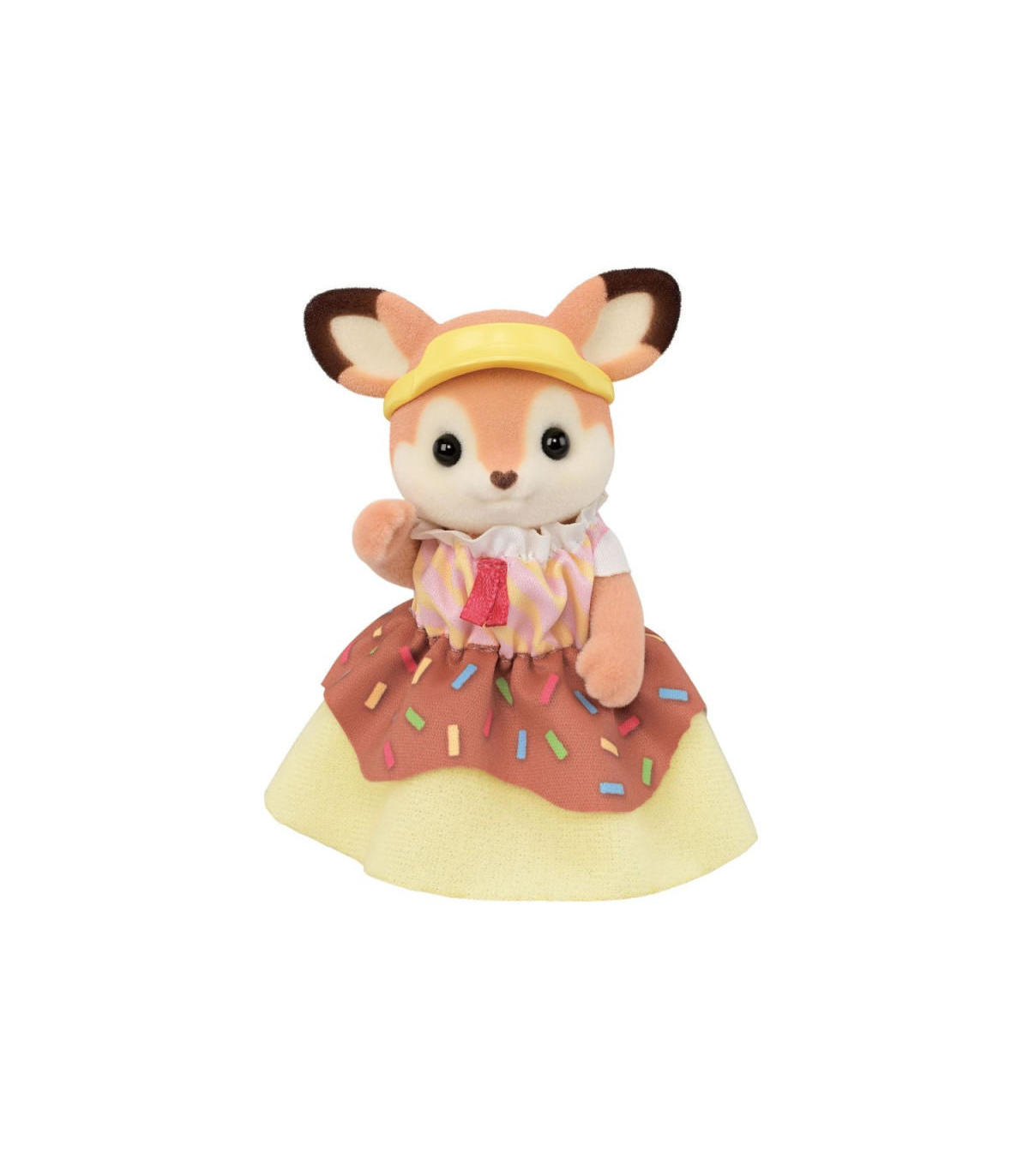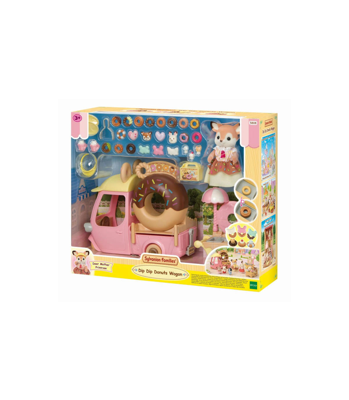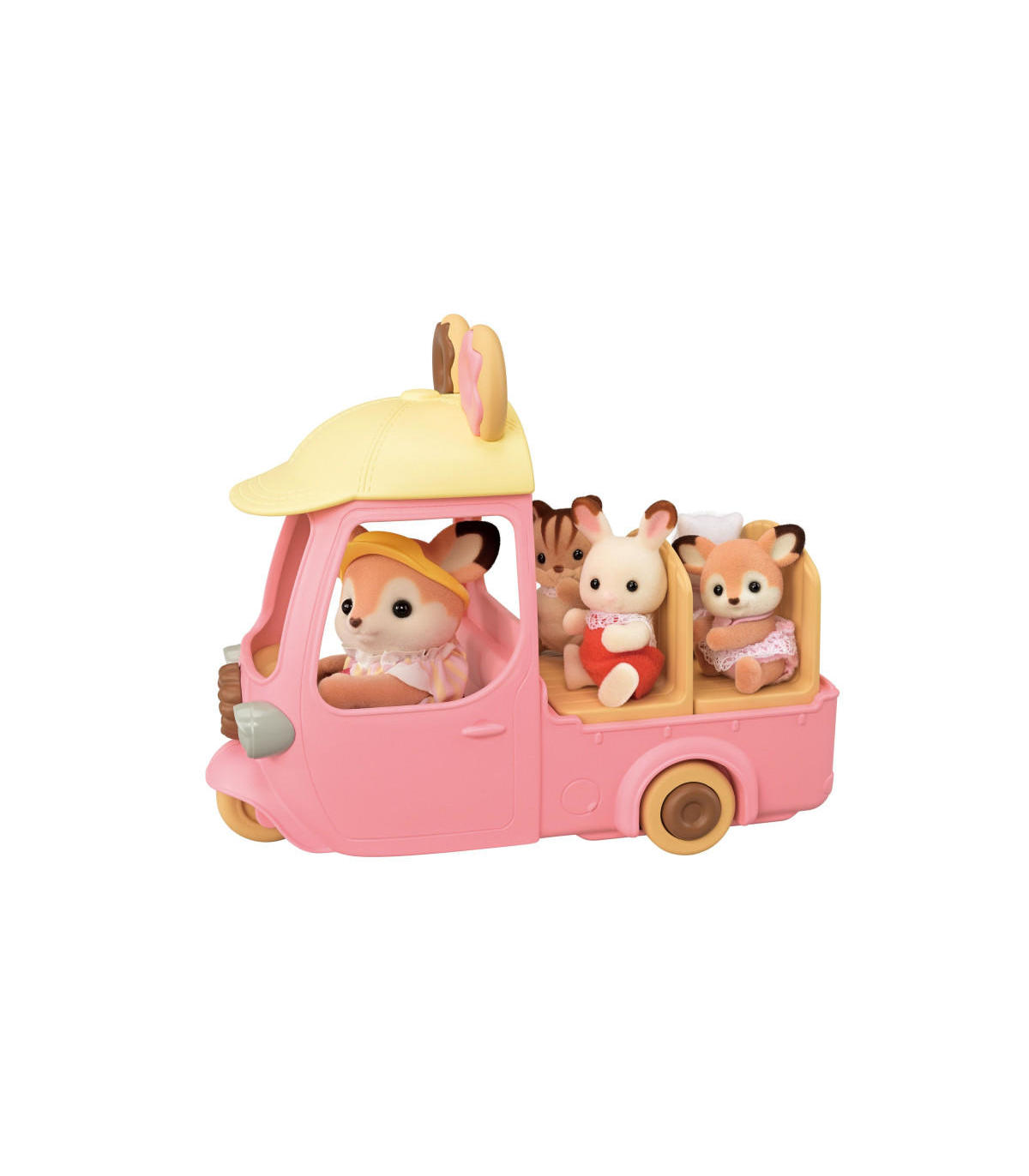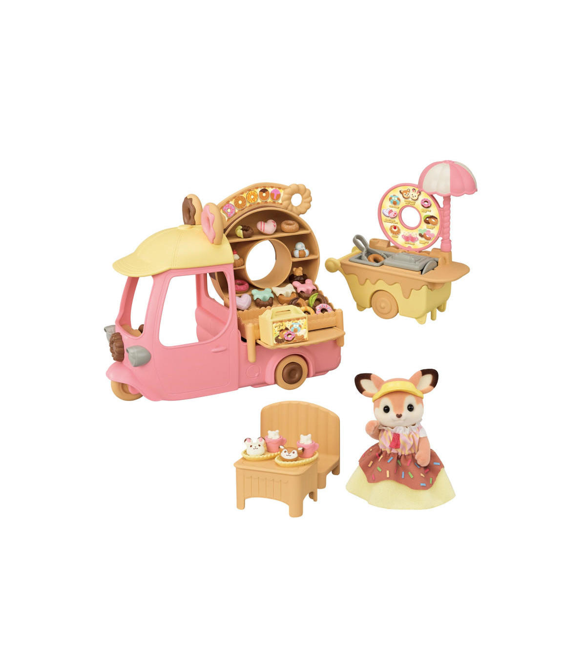 ¡Busca tu mejor delantal porque querrás copiar los dónuts de Primrose Ciervo nada más verlos! En la Aldea Sylvanian todos reconocen el inconfundible dónut gigante de la Furgoneta de Donuts. Primrose, la mamá Ciervo, conduce la furgoneta por toda la Aldea para llevar a cualquier rincón los favoritos de todos. Y es que no dejan indiferente a nadie: rosquillas de dos sabores glaseado de fresa, de menta, de vainilla ¿topping con forma de pingüino? ¡Irresistibles! La Furgoneta de Donuts incluye figura de la mamá Ciervo, furgoneta, carro de comida, mesa, dos bancos y accesorios de comida. Los bancos sirven de asientos para transformar la furgoneta en mini bus. Figuras y mobiliario se venden por separado. Edad recomendada: +3 años.