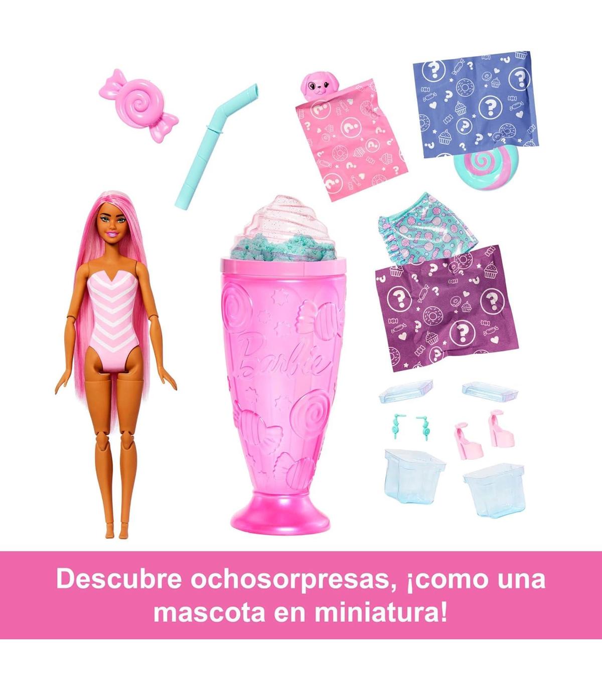 Barbie Pop Reveal Dulces Muñeca Sorpresa Cada conjunto incluye ocho sorpresas, de modo que las muñecas de la Colección Dulces de Barbie Pop Reveal ofrecen una experiencia sensorial de lo más divertida con temática de dulces al desempaquetarlas. Desenrosca la tapa de nata montada para revelar arena moldeable y atraviesa la película con la pajita para descubrir una sorpresa blandita y un adorable accesorio para la pajita. Para seguir abriendo, retira la película del vaso y descubrirás una muñeca de moda Barbie Sweet Swirl con un dulce aroma, articulaciones para colocarla en diferentes poses y una larga melena rosa. Encuentra los dos cubitos de hielo que se abren para descubrir las sorpresas de su interior: unos pendientes con temática de caramelos y un par de zapatos adorables. Puedes usar los cubitos de hielo para guardar los accesorios o divertirte descubriendo su contenido tantas veces como quieras. Las bolsas misteriosas incluyen más piezas para vestir o contar historias: una falda con estampado de caramelos, un cachorrito blandito con perfume y un accesorio de camita para mascotas a juego. Utiliza agua muy fría para transformar la cara de la muñeca, y agua templada para devolverle su aspecto original y repetir el cambio de color tantas veces como quieras. Con tanto estímulo sensorial, las muñecas de la Colección Dulces de Barbie Pop Reveal son un regalo fantástico para niños y niñas a partir de 3 años.