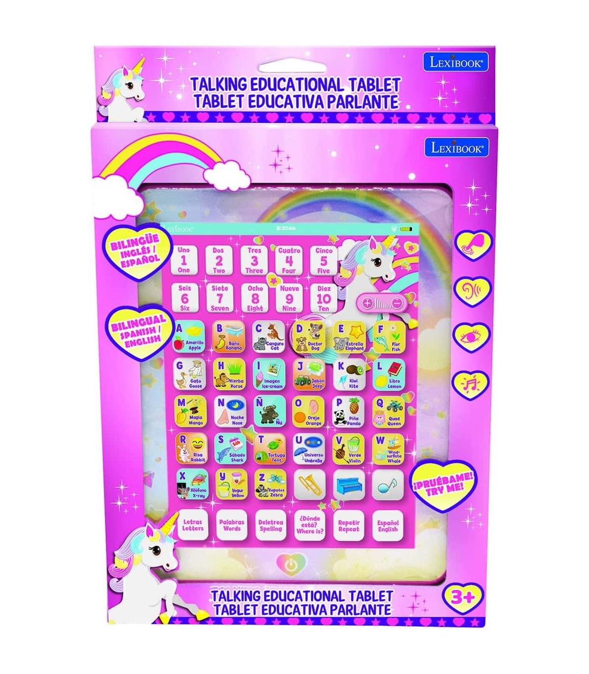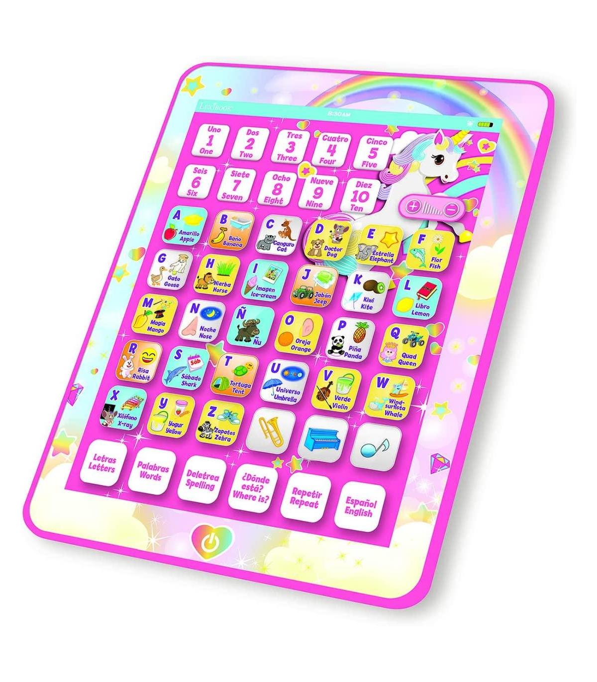 Tablet parlante con pantalla táctil y sonidos: El niño pulsa cualquier tecla para que la tablet diga la letra, número o palabra correspondiente en inglés y español.