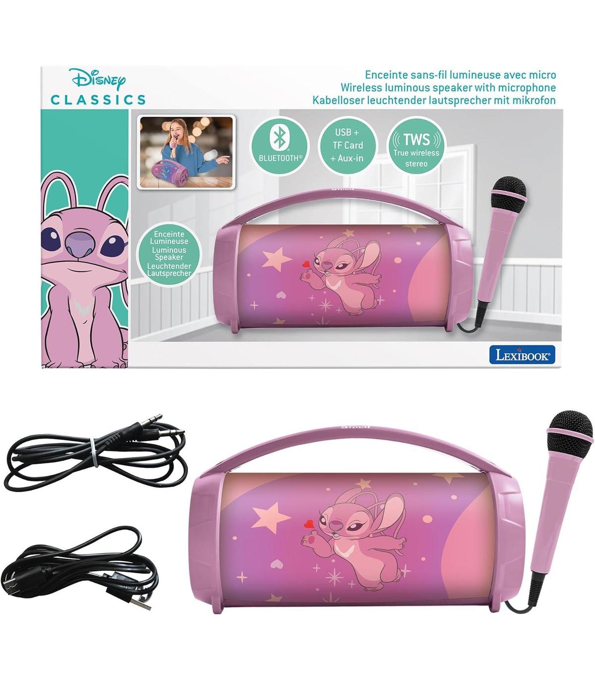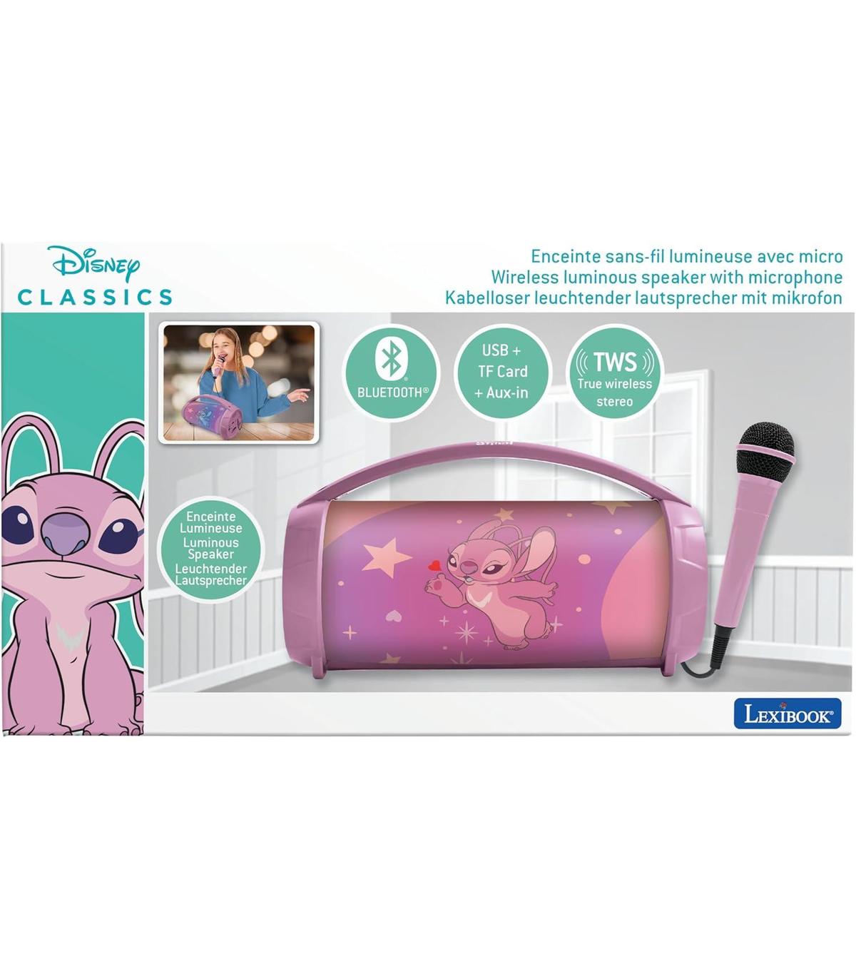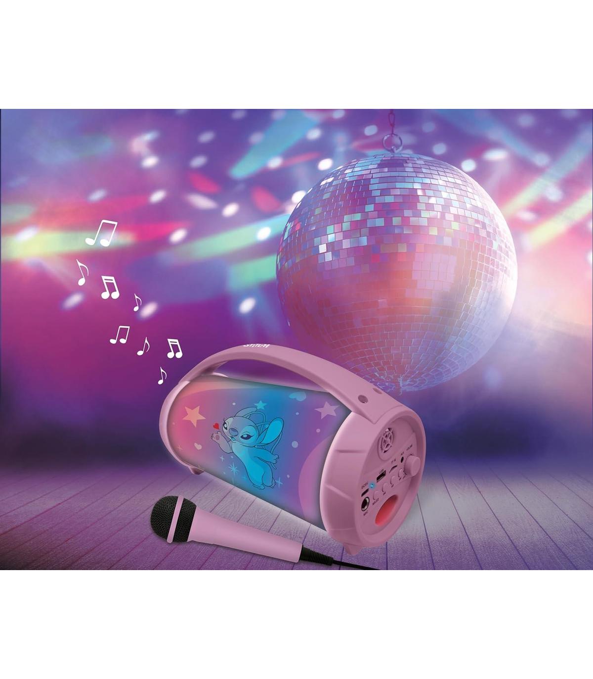 EXPERIENCIA DE KARAOKE INMERSIVA: con el micrófono incorporado, transforma tu espacio en una divertida escena de karaoke con Angel, Stitch, Lilo y Leroy.