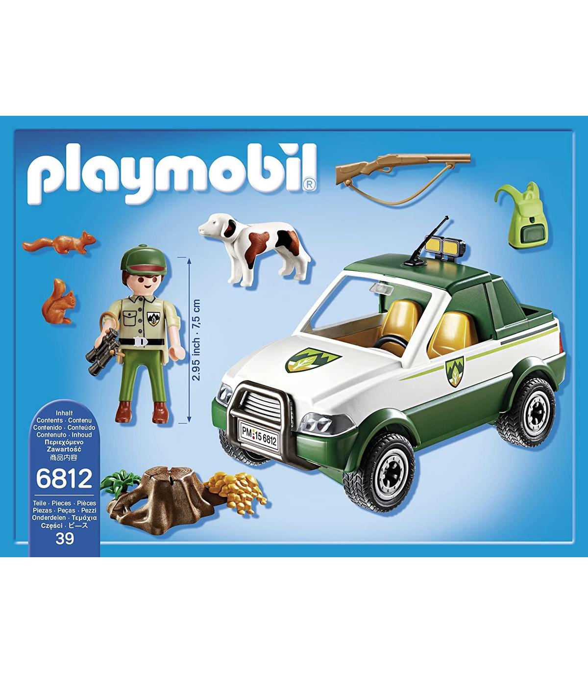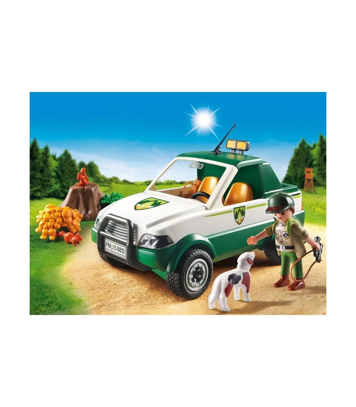 Vehiculo con remolque para transportar animales. Contiene dos figuras, un elefante, un bidon de gasolina, cantimplora, prismaticos, walki, herramienta, pistola y rifle.
