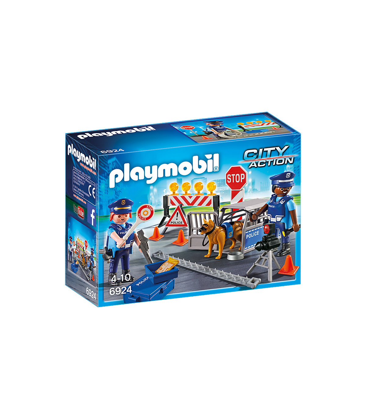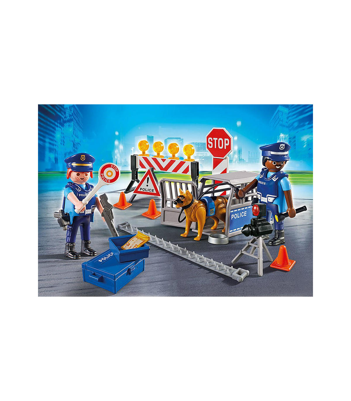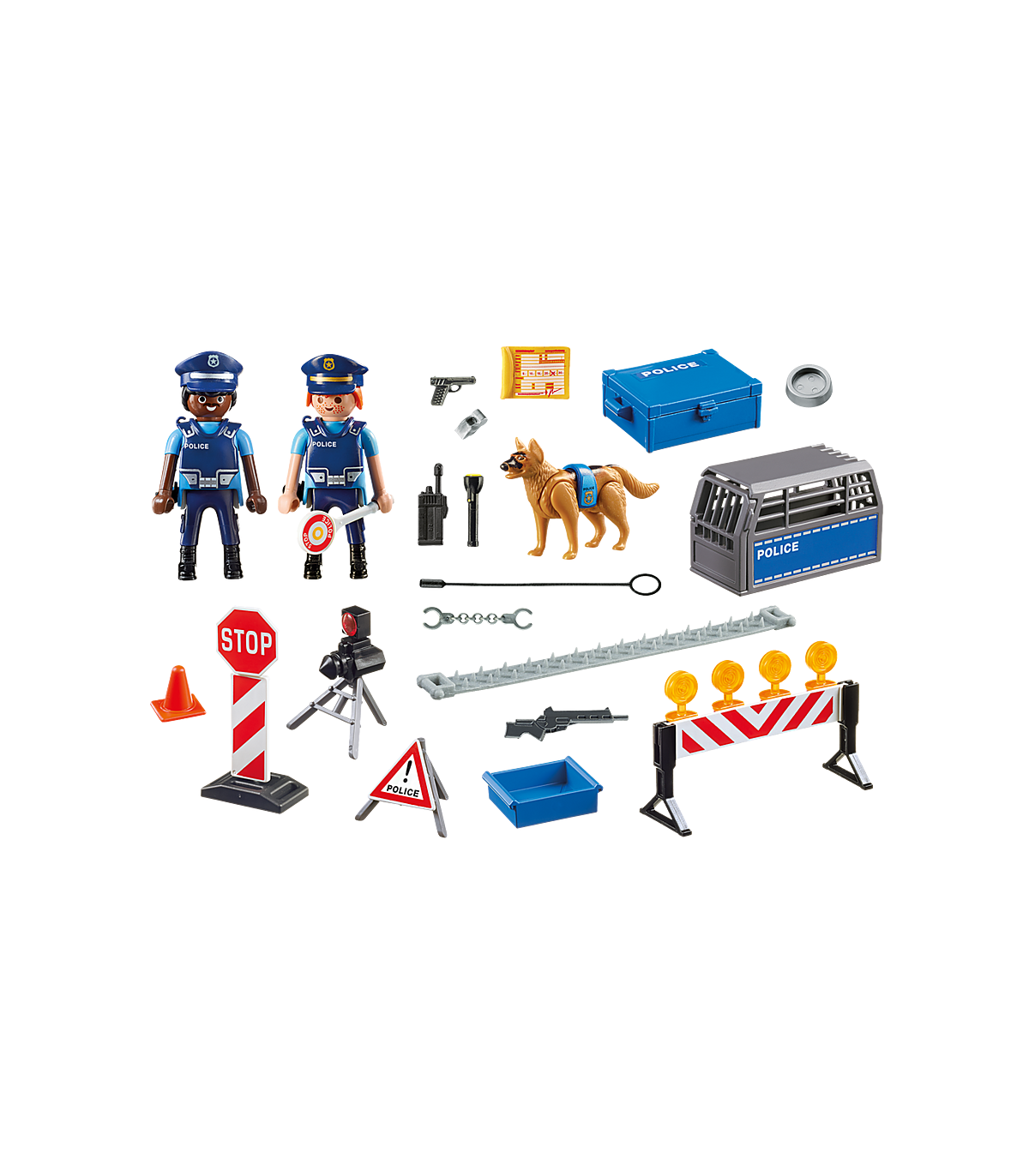 Playmobil 6924 Control De Policia Atención - una banda de ladrones está huyendo. "¡Necesitamos un bloqueo en la carretera principal inmediatamente!" llama el policía a través del walkie-talkie. "No hay problema, nos encargaremos de ello", responden sus dos compañeros. Colocan una barrera, una señal de stop, un cono de tráfico y despliegan la tira de clavos. Por supuesto, el tienen la ayuda del perro policía. "Nadie pasará este control de carretera", los dos oficiales están satisfechos.