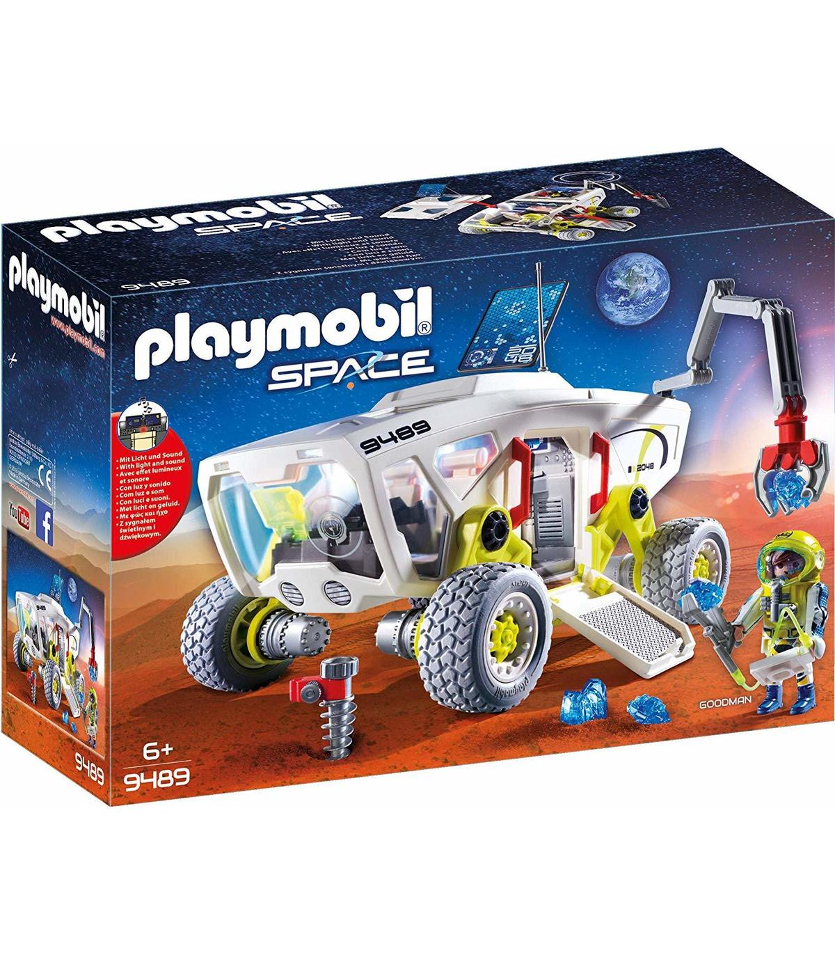 Contenido: 1 PLAYMOBIL Space Vehículo de reconocimiento, Juego de 74 piezas con instrucciones: 1 Vehículo de reconocimiento, 73 accesorios (requiere 2 micro baterías 1.5 V, no incluidas), Material: plástico, AxPxAl: 26x17x18 cm, 9489