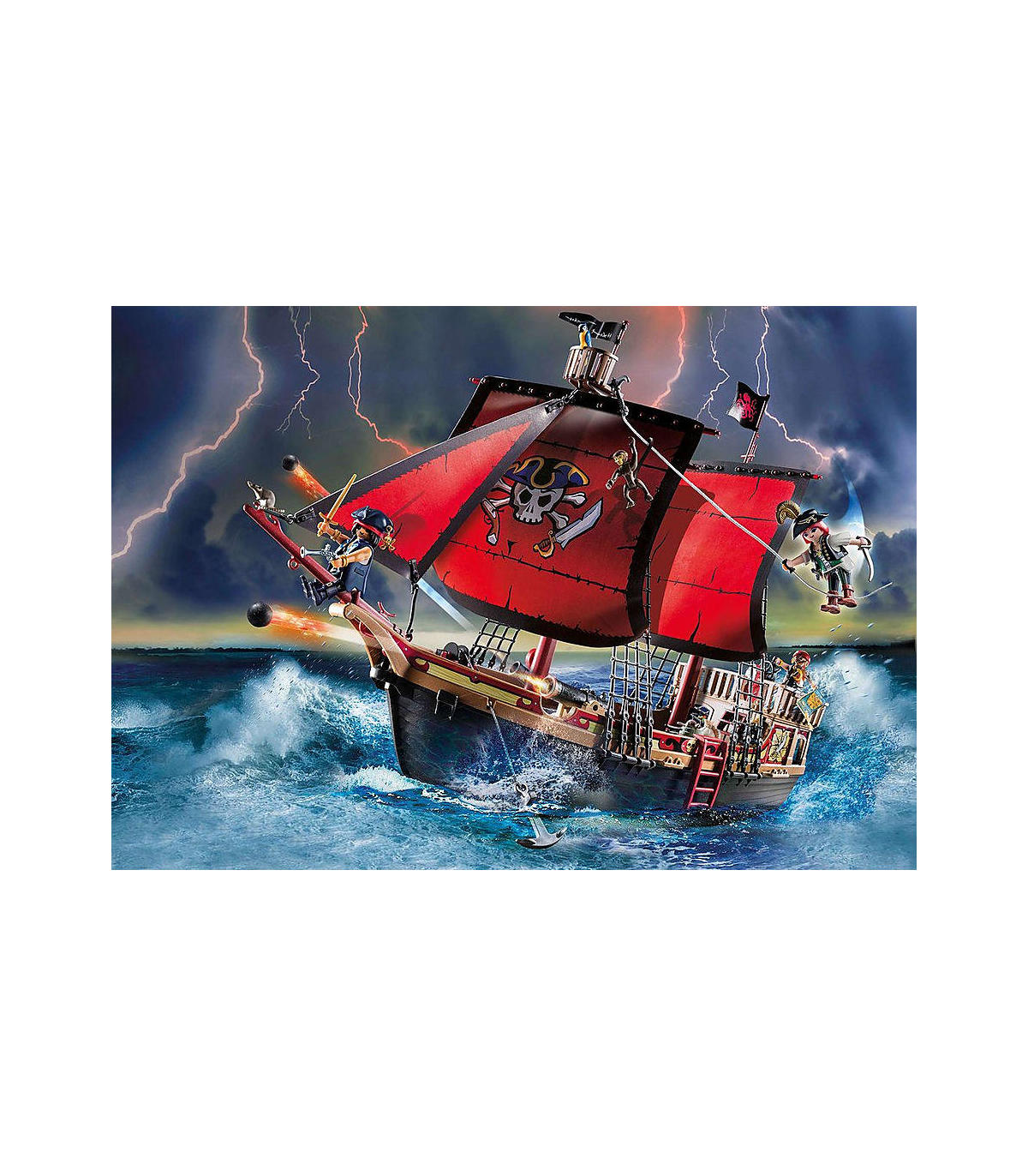 Playmobil 70411 Barco Pirata Calavera Diversión para los pequeños piratas: PLAYMOBIL Barco Pirata Calavera con 3 piratas, 2 cañones y muchos accesorios para jugar. 3 piratas armados, mono, rata y loro, barco flotante con ancla, cañones posicionados, equipados y listos para disparar, también incluyen 3 velas, puerta en el suelo que se abre para jugar en su interior. Accede al interior del barco desde la abertura en el centro. ¡El barco flota! Está listo para su uso en piscinas o tinas. El barco está equipado con ruedas, para que pueda moverse sin esfuerzo por el suelo. Contenido: 1 PLAYMOBIL Pirates Barco Pirata Calavera, juego de 132 piezas con instrucciones: 1 barco pirata, 3 figuras, 128 accesorios, material: plástico, L x P x A: 61 x 21 x 55 cm, 70411