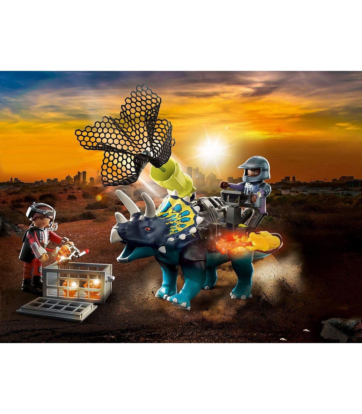 Dino-Power: PLAYMOBIL Triceratops: Alboroto en torno a las piedras legendarias con 1 Dino y Jaden del Equipo Dino Rise, Así como con 2 mini robots y una figura de la Comet Corporation Triceraptos con armadura desmontable, 1 cañón de red trampa, 1 cañón de llamas, Asiento con panel de control para 1 figura, 2 robots con brazo de agarre, 1 caja de rejilla y mucho más Juego de figuras para niños a partir de 5 años: Ideal para el tamaño de sus manos y bordes redondeados agradables al tacto Para jugar a diario: Incluye instrucciones para montarlo con ayuda de los padres, Alta calidad y diseño robusto, Limpieza de las piezas (sin pegatinas) con agua corriente y sin químicos Contenido: 1x PLAYMOBIL Dino Rise Triceraptos: Batalla por las piedras legendarias, Set de figuras de juego de 40 piezas con numeración del embalaje interior así como instrucciones de montaje: 1 dino, 2 mini-robots, 2 figuras, 35 accesorios, Material: plástico, LxDxH: Triceratops con armadura: aprox. 22x12,5x11,5 cm, Peso: 244x g, 70627