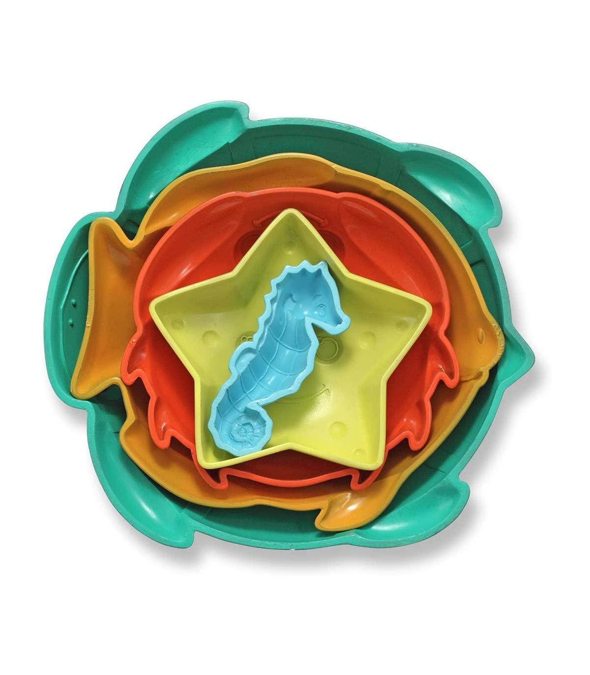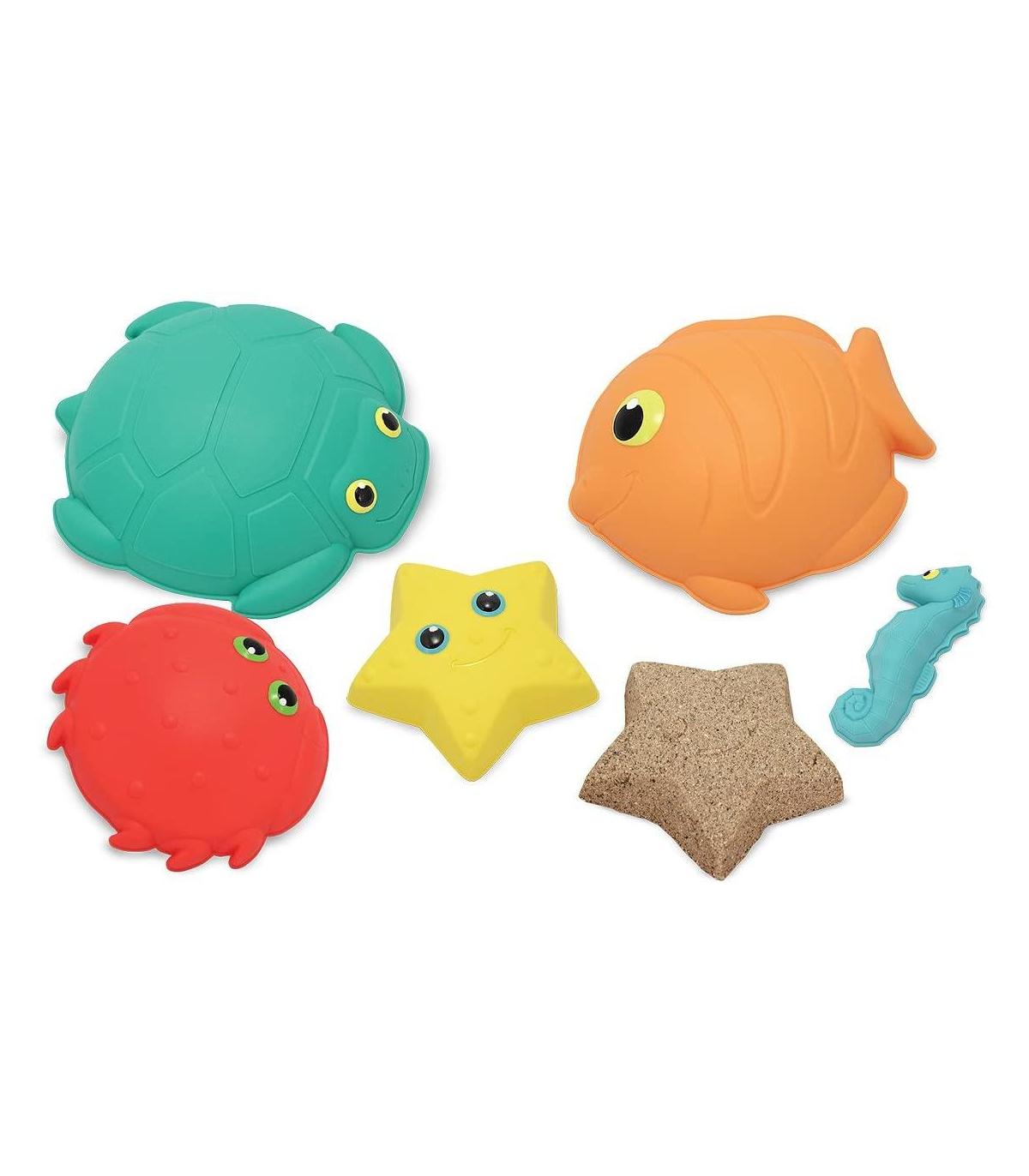 Juego para moldear arena para la playa o el arenero Incluye 5 amigos para jugar en la arena: una tortuga, un pez, un cangrejo, una estrella de mar y un caballito de mar Ideal para jugar durante horas en el arenero o en la playa Construcción de plástico resistente Todos los moldes se guardan ordenadamente, uno dentro del otro, dentro de la tortuga