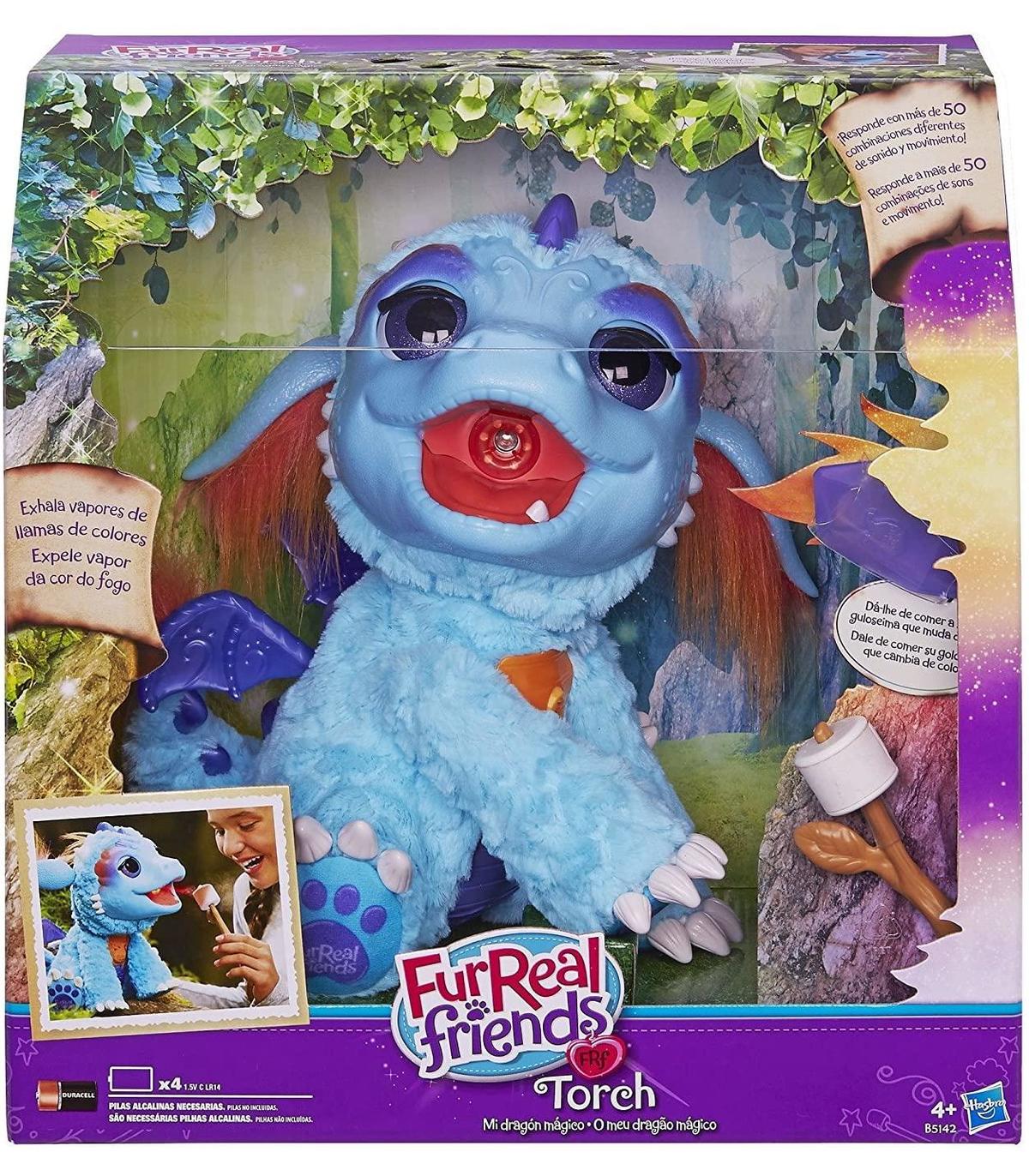 Furreal Friends Torch, Mi dragón mágico Torch es un precioso bebé dragón mágico que lanzará "fuego" por la boca que parece de verdad. Incluye un Marshmallow que es su comida favorita. Al acercársela lanzará vapor de agua para tostarlo. Si lo acaricias te responderá con dulces sonidos y movimien Mi dragón mágico responde al tacto con más de 50 combinaciones diferentes de sonido y movimiento Dale de comer su golosina que cambia de color Llena el depósito de agua y exhalará vapores de llamas de colores (y eructará) Toca su nariz y te sorprenderá con divertidas respuestas