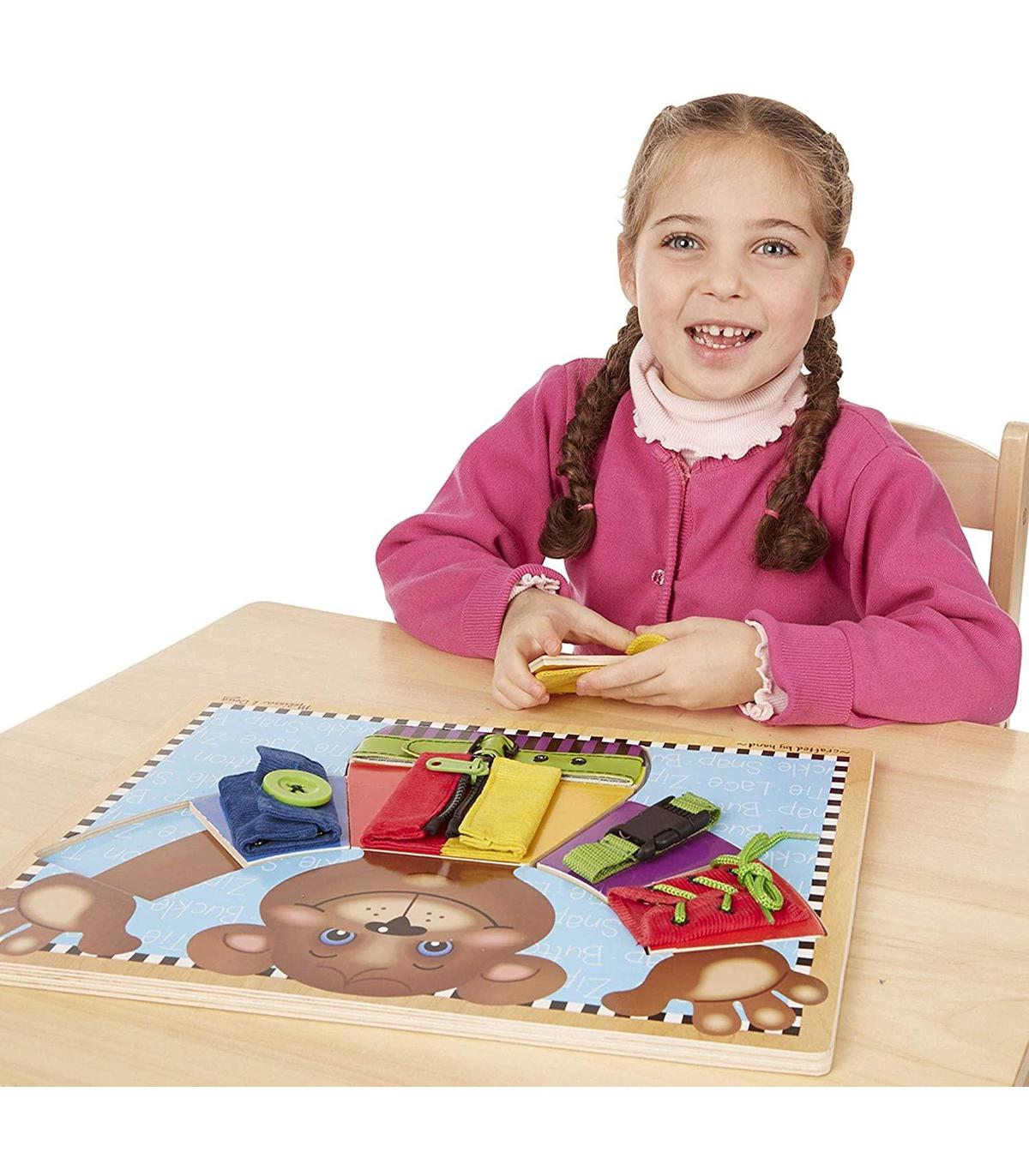 Este oso de madera siempre está sonriendo, pero él es más feliz cuando está vestido completamente! Cada habilidad está contenida en una pieza del rompecabezas, de madera para facilitar la práctica y desarrollar las habilidades motoras finas.