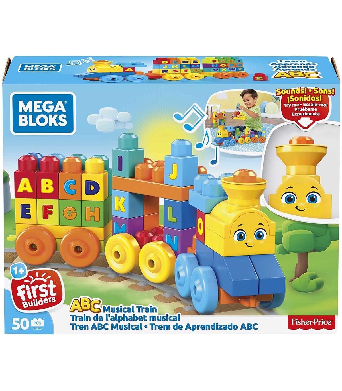 Tren Musical Abc Bloques de construcción para bebés y niños hasta 5 años regalo óptimo de mega bloks para aprender mientras construyes Conjunto de juego de 50 piezas que incluye tres bases con ruedas, bloques de construcción y formas especiales de tren Tren musical fácil de construir para aprender el abecedario aprieta la chimenea para activar sonidos y música