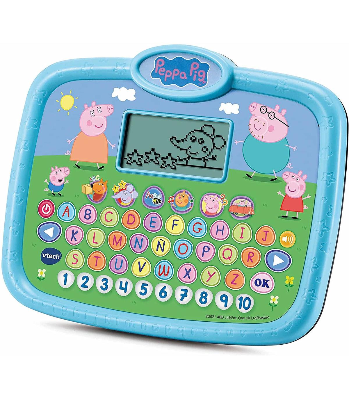 VERSIÓN ESPAÑOLA TIPO DE PRODUCTO: Tablet con pantalla LCD y teclas de letras para aprender el alfabeto, vocabulario, los números, a contar y los instrumentos DIDÁCTICO: Enseña a contar, letras, vocabulario, solución de problemas, música y coordinación ojo-mano VOCES ORIGINALES: Con la voz original de Peppa Pig BOTONES INTERACTIVOS: Pulsa los botones de números o los botones de personajes para añadir alegres sonidos a la música ACTIVIDADES INTERACTIVAS: Descubre seis actividades ineractivas para aprender vocabulario, las letras, los números, a cantar, música... ¡y juega con Peppa, George, Mamá Pig, Papá Pig y sus mejores amigos! VTECH CUIDA EL PLANETA: El embalaje de este juguete está compuesto en un 90% de cartón reciclable