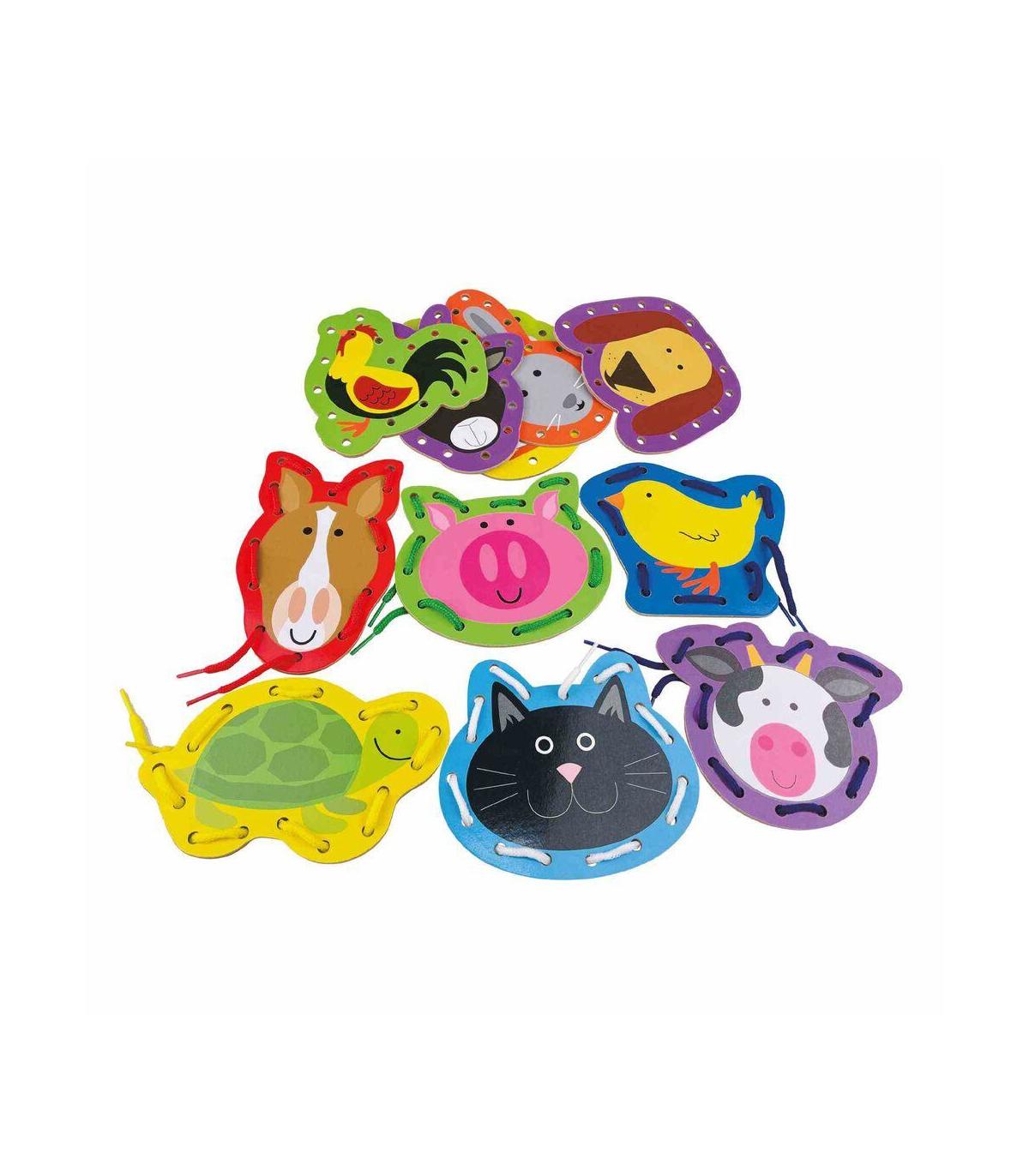 Entrelazos Animales Set de Enlazados Animales - Juguete Montessori El Set de Enlazados Animales es un juguete educativo ideal para niños a partir de 3 años. Con 18 piezas de madera, este juego está diseñado para estimular la creatividad, la coordinación y las habilidades motoras de los pequeños, todo ello mientras se divierten. Siguiendo el enfoque Montessori, este juguete es una excelente herramienta para fomentar el aprendizaje a través del juego. Características principales: 18 piezas: Incluye animales de madera con agujeros para pasar la cuerda. Material seguro: Hecho de madera duradera y respetuosa con el medio ambiente. Juguete Montessori: Estimula el aprendizaje autónomo y el desarrollo cognitivo. Edad recomendada: A partir de 3 años. Beneficios educativos: Desarrollo de habilidades motoras: El juego de enlazado ayuda a los niños a mejorar la coordinación mano-ojo y la destreza. Estimulación cognitiva: Al enlazar y desatar los animales, los pequeños también desarrollan habilidades de pensamiento lógico y resolución de problemas. Aprendizaje sensorial: Los niños pueden tocar y sentir las diferentes texturas de las piezas de madera, lo que estimula sus sentidos. Juego social y comunicativo: Este juguete fomenta la interacción entre los niños, ayudando a mejorar sus habilidades comunicativas mientras juegan juntos.