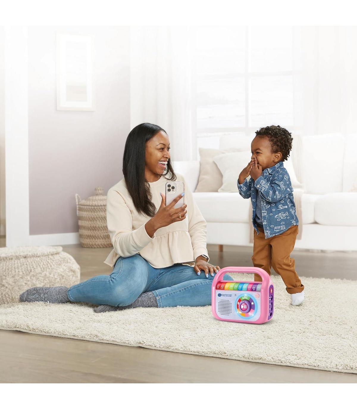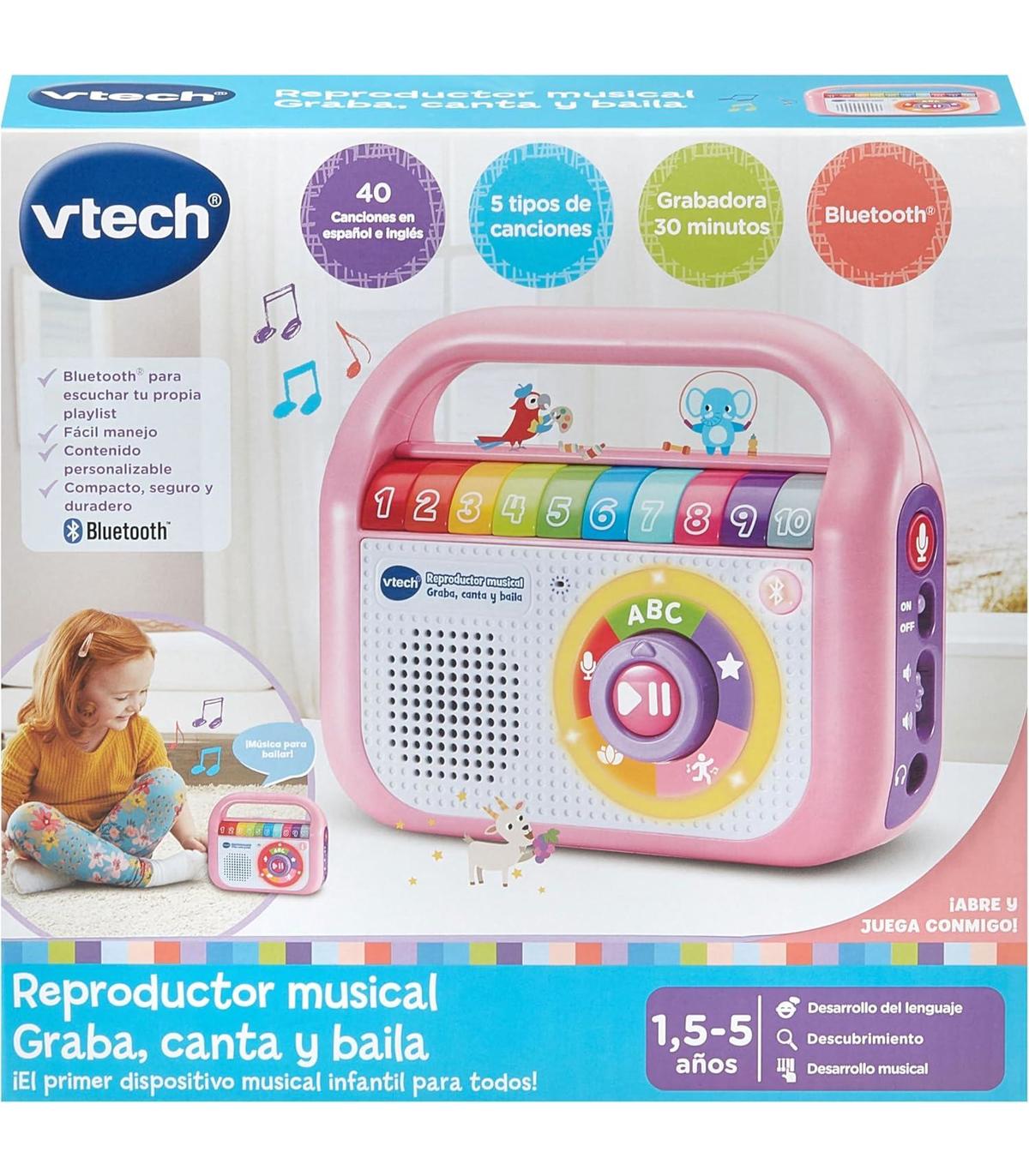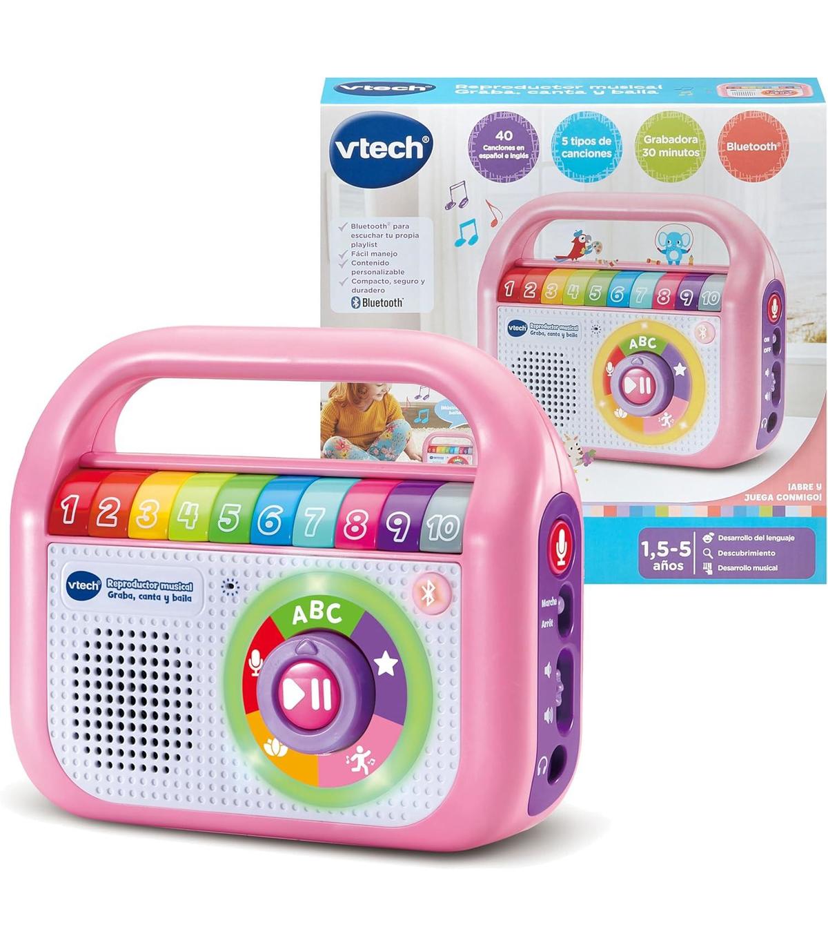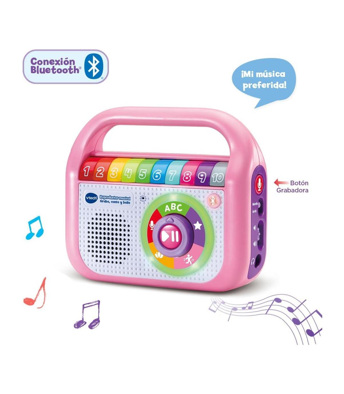 CONTENIDO EN ESPAÑOL. Reproductor musical, radio interactiva con conexión Bluetooth. Juguete para niños +1,5 años. Diseño resistente. INGLÉS Y ESPAÑOL: Incluye 40 canciones en inglés y español para aprender cantando. GRABADORA: Dispone de 30 minutos para grabar audios, graba tu voz para que el peque pueda escuchar tus cuentos e historias ¡estés donde estés! CONEXIÓN BLUETOOTH: Para disfrutar de tu propia música desde tu MP3 o Smartphone (no incluidos). MÚSICA PARA APRENDER modales, higiene, empatía, buenas costumbres y mucho más. RELAX: para relajarse escuchando dulces melodías de los mejores compositores. PARA BAILAR con amigos o en familia. 10 BOTONES DE COLORES: Personaliza cada botón con una canción, historia o mensaje de voz. Gira la rueda para elegir un tipo de música y escuchar las canciones incluidas. ASPECTOS EDUCATIVOS: Desarrollo del lenguaje, Exploración y descubrimiento y Creatividad musical.
