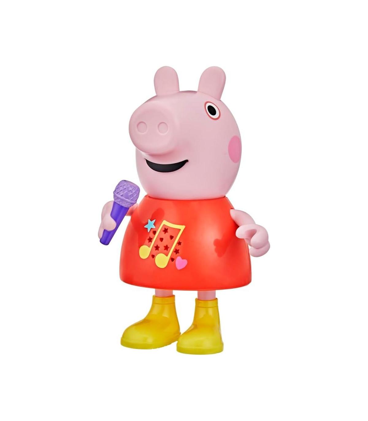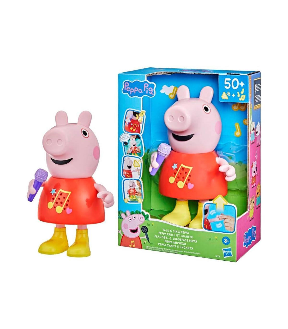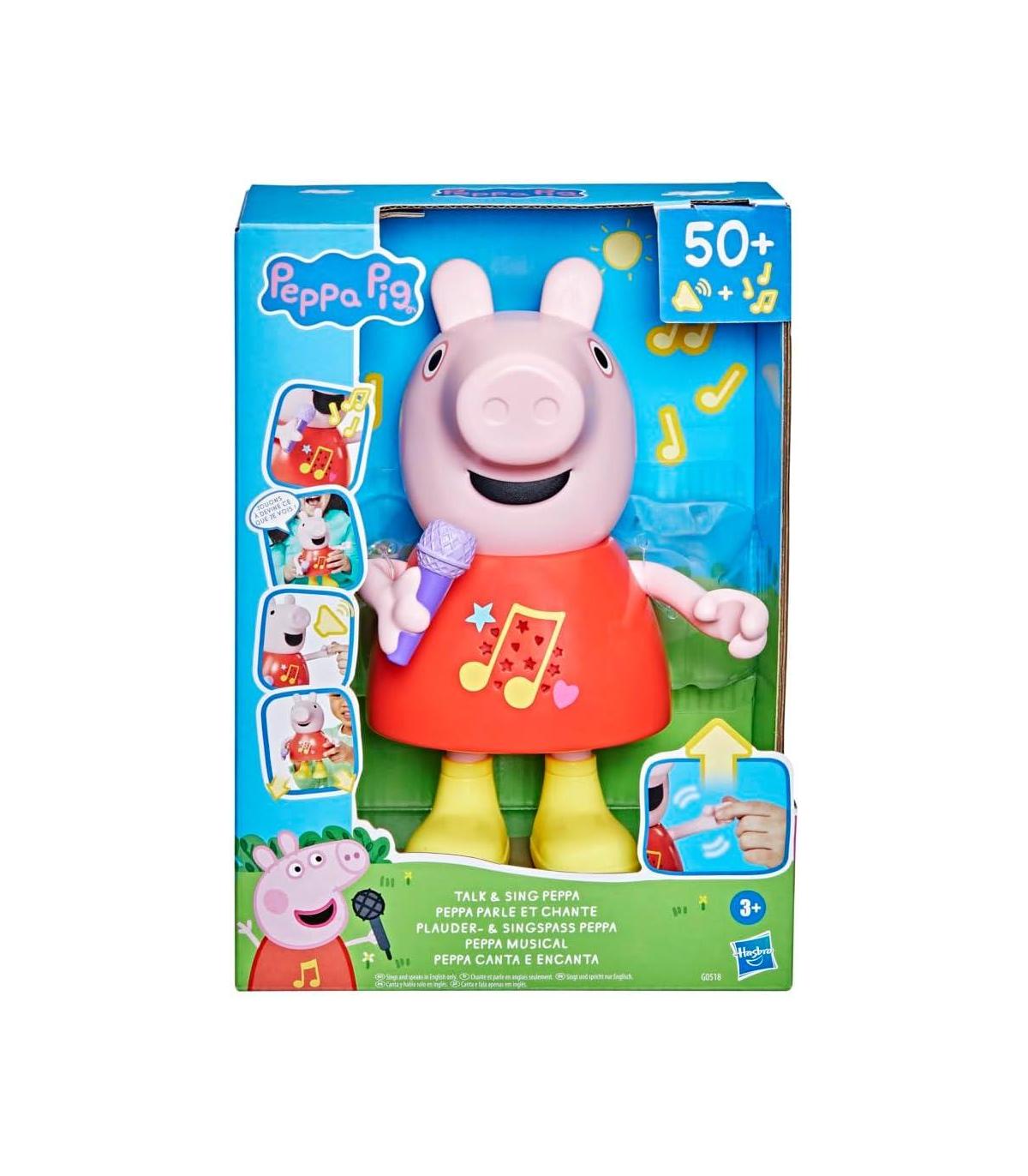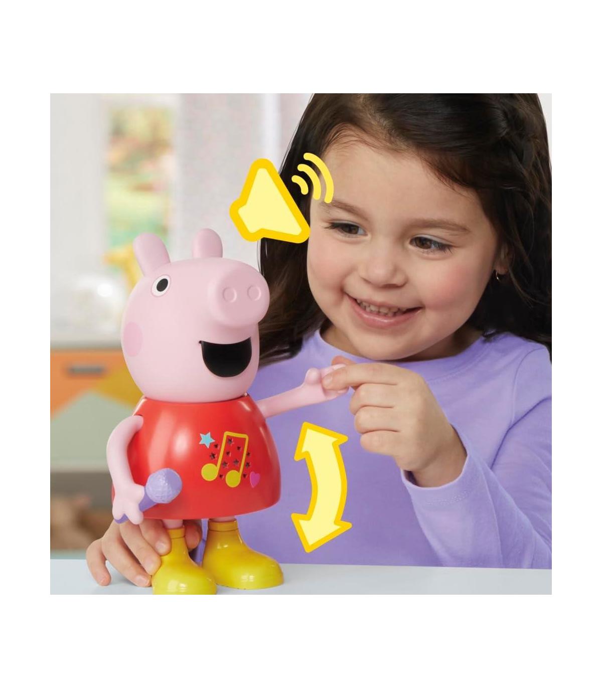 Peppa Pig Peppa Musical MUÑECA PEPPA PIG QUE HABLA Y CANTA CON MÁS DE 50 SONIDOS: ¡Hay tantas maneras de jugar con esta adorable muñeca de Peppa de 20 cm de alto! Mueve su micrófono hacia arriba o hacia abajo para pasar del modo cantar al modo hablar USA SU BRAZO PARA MOVER SU BOCA: ¡Los niños pueden colocar el micrófono en modo hablar o cantar, y luego mover su brazo hacia arriba y hacia abajo para hacer que mueva la boca para que hable, juegue a Veoveo o cante una canción! (Habla y canta en español solamente). 4 CANCIONES FAVORITAS: Cuando los niños suben el micrófono de Peppa y le mueven el otro brazo, este juguete musical canta 4 canciones diferentes, incluyendo el tema musical de Peppa JUEGA A ""VEOVEO"" Y OYE LINDAS FRASES: Este juguete Peppa Pig habla y juega el juego ""Veoveo"" cuando los niños bajan el micrófono y le mueven el otro brazo hacia arriba y hacia abajo HAZ QUE ""SALTE"" PARA OÍR SONIDOS DE CHARCOS DE BARRO: Cuando los niños hacen que Peppa baile o salte, este juguete emitirá efectos de sonido de charcos de barro