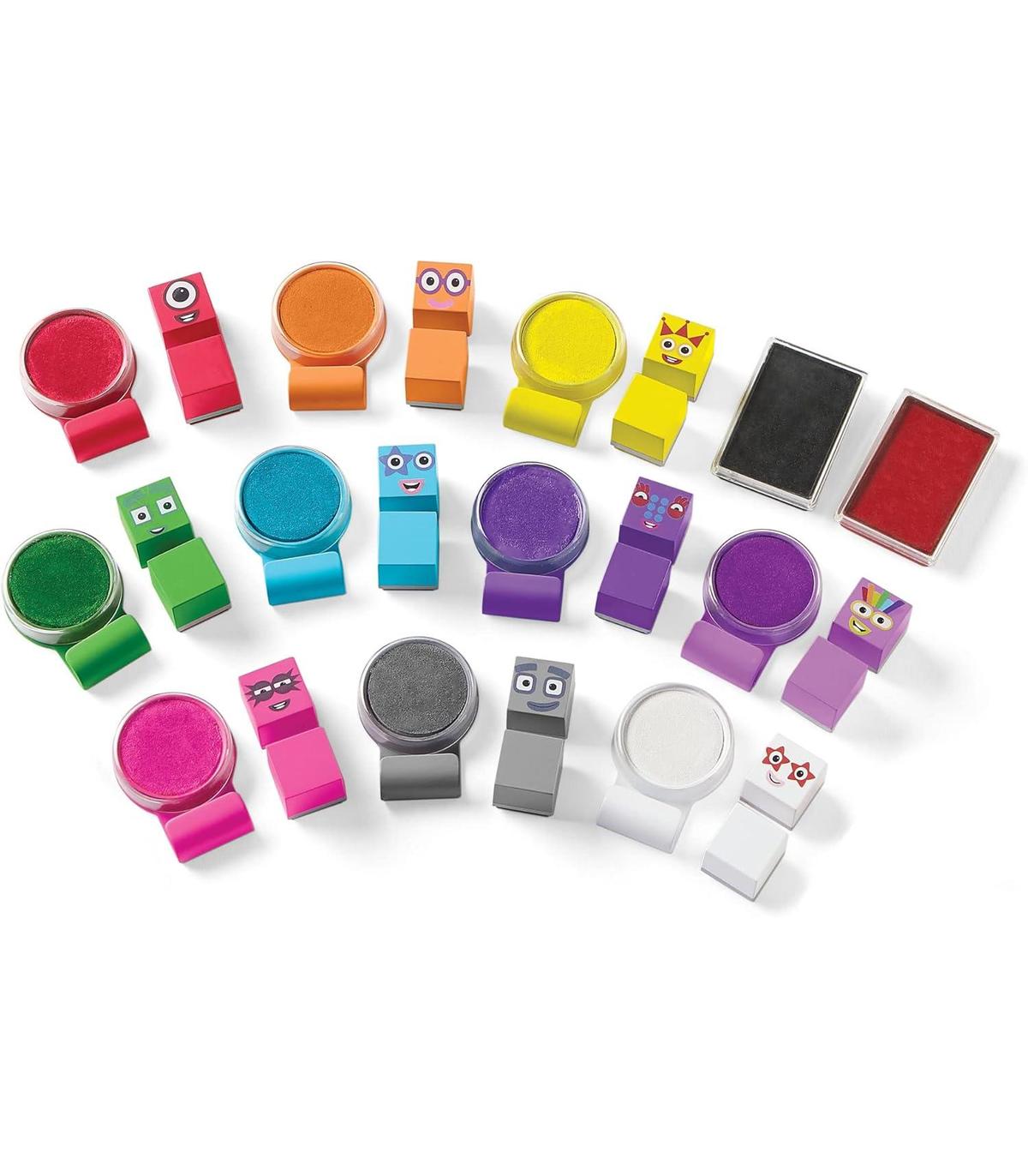 LOS PERSONAJES NUMBERBLOCKS DE LA SERIE DE TV: Recrea el episodio del Parque de Stampolines en casa o en el aula con este set de manualidades que cuenta con 20 sellos reutilizables y 12 tampones de tinta lavable de los colores de los Numberblocks.