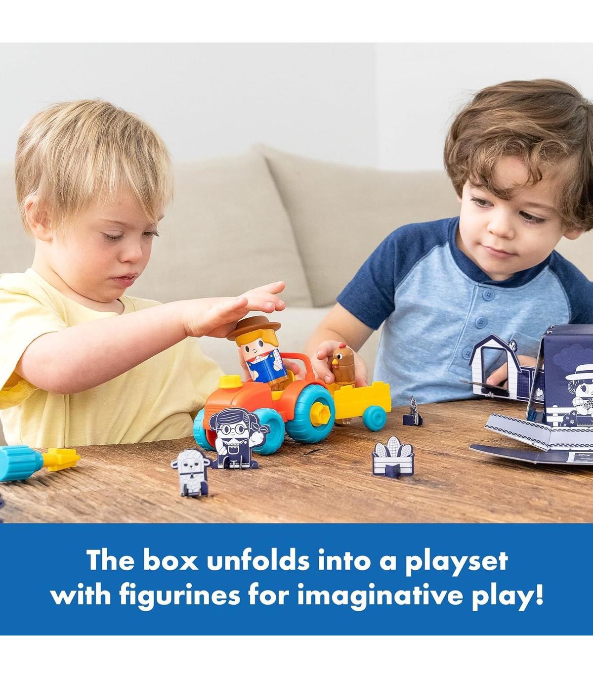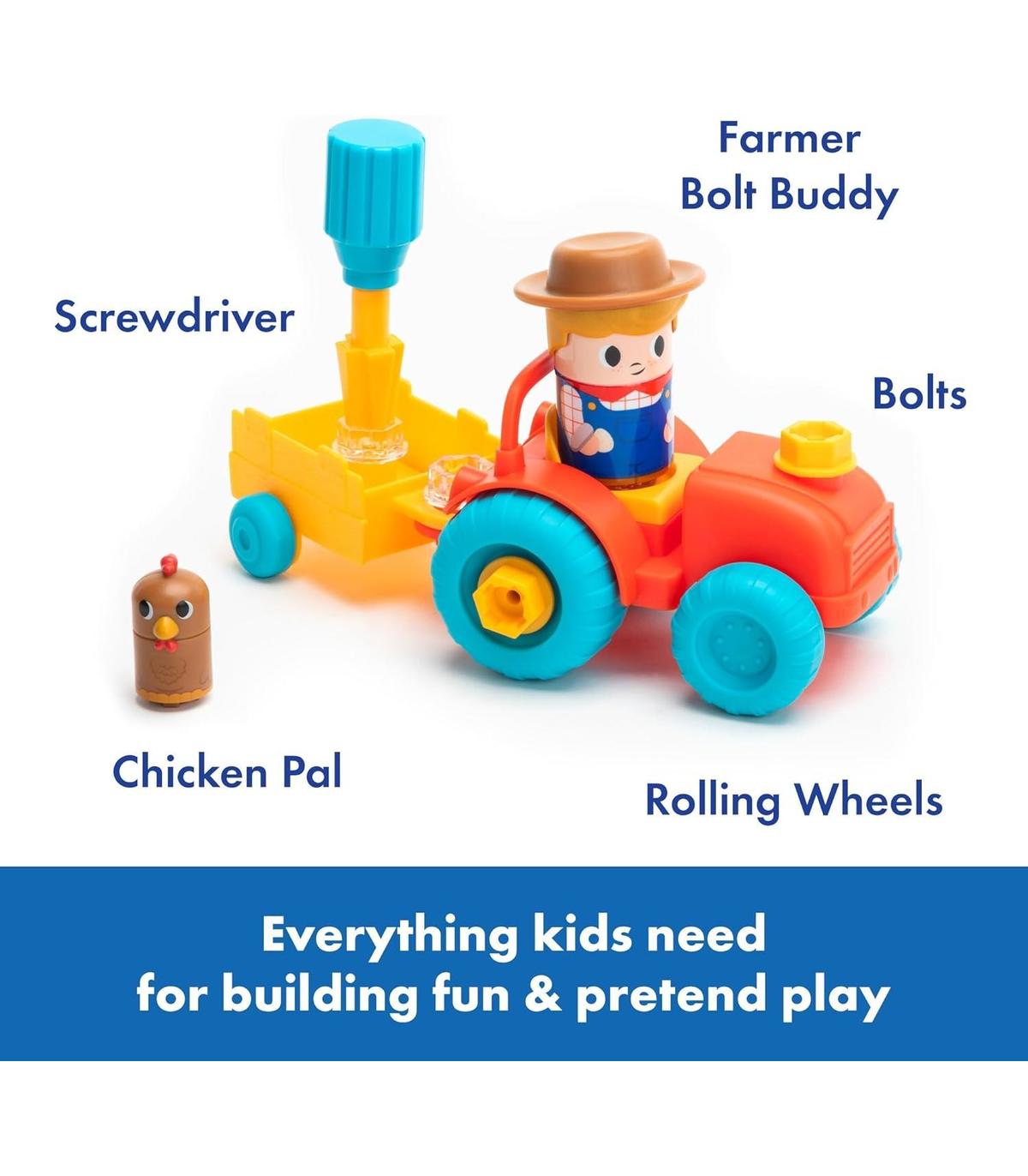 INCLUYE: Destornillador apto para niños, 7 tornillos decorativos, 4 piezas encajables para montar el tractor, figura atornillable Bolt Buddy de granjero, maíz y remolque