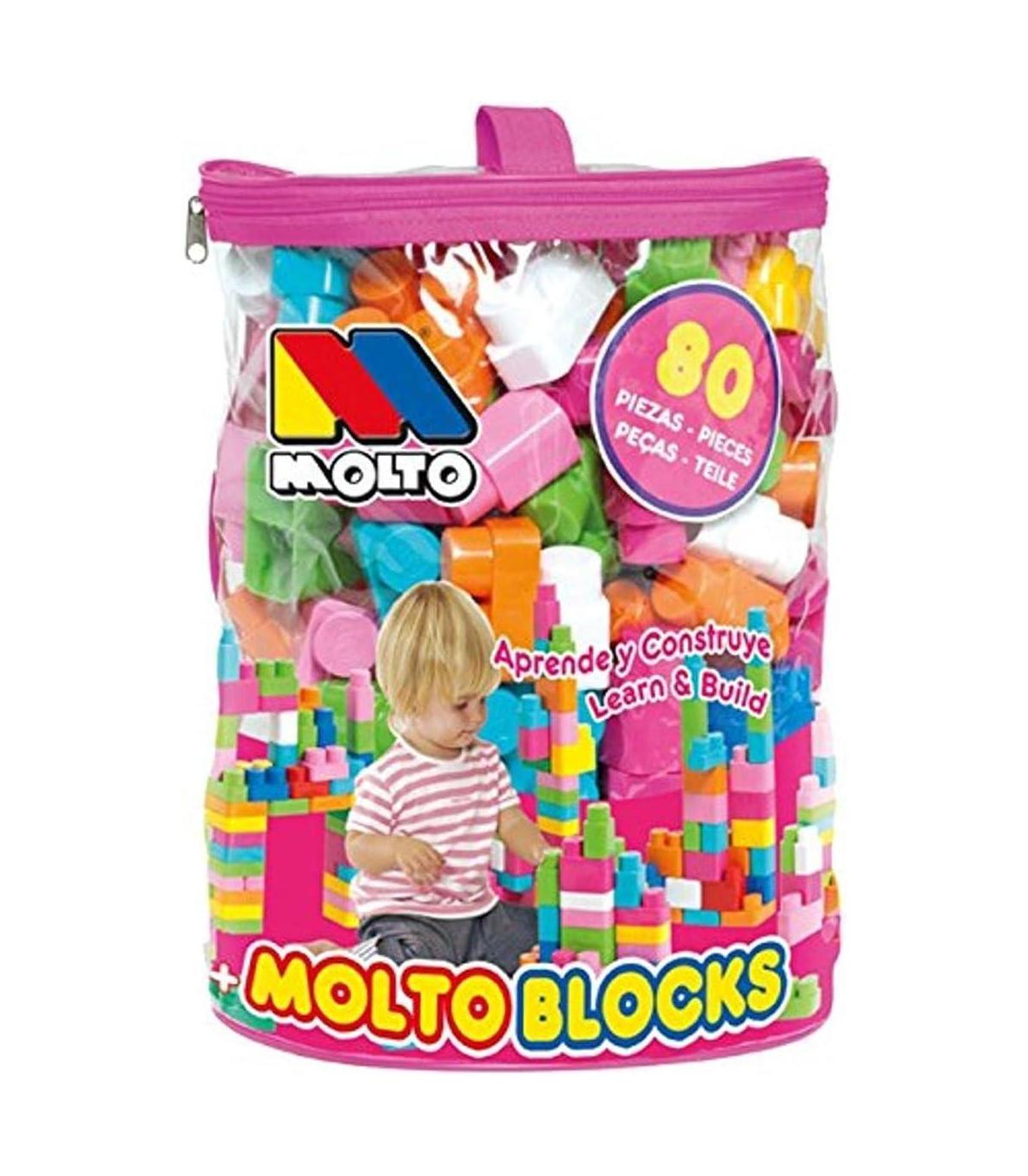 Molto Bolsa 80 Bloques Rosa Set de bloques Molto modelo rosa. Con 80 piezas encajables con preciosos colores, para crear divertidas y originales construcciones. Aprende a contar y los colores con estas piezas.