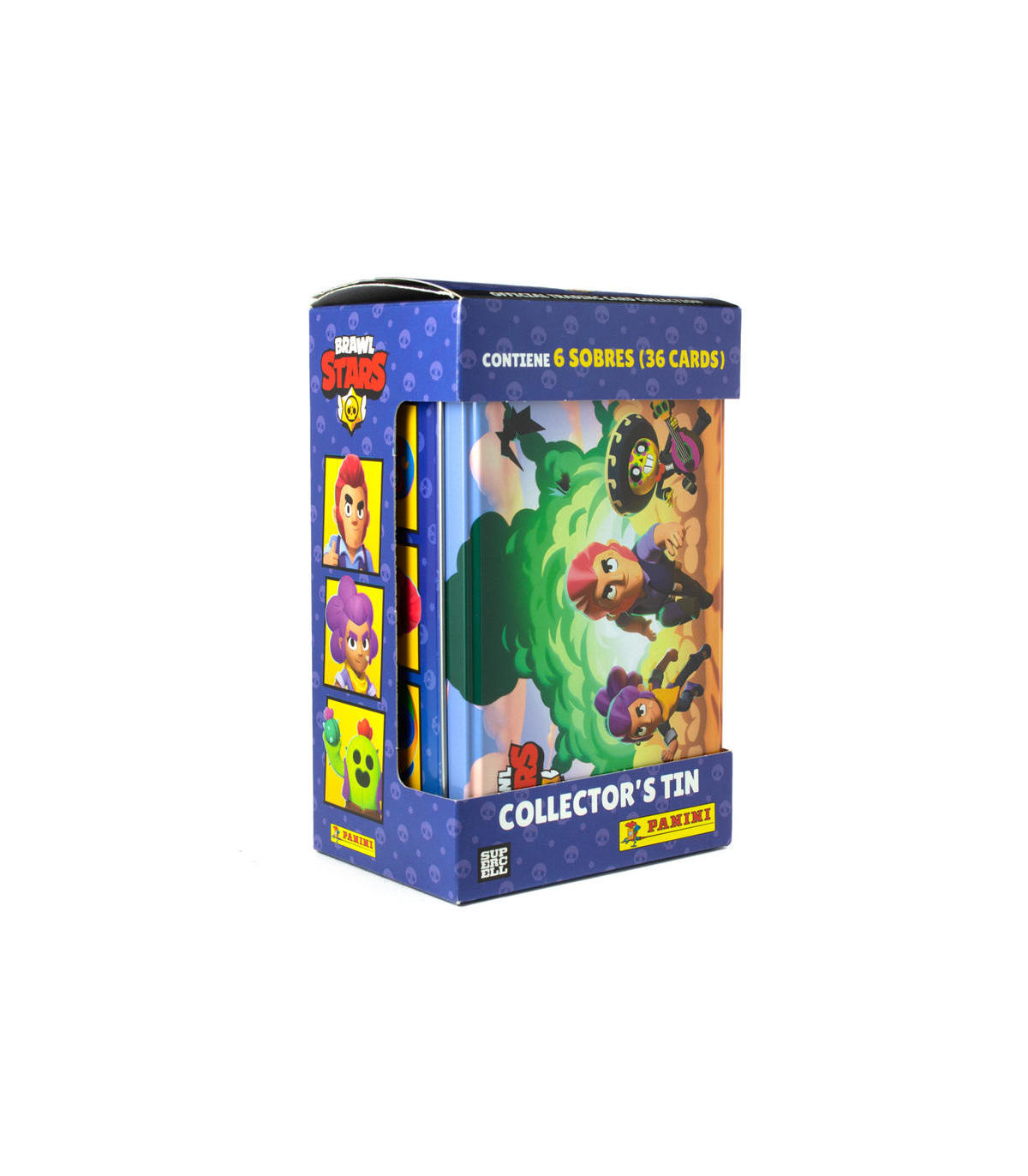 Lata de edición limitada para coleccionistas de la colección Brawl Stars 2025-2026 de Panini. La lata contiene 6 sobres con 36 cartas. Medidas: 16 x 11 x 8 cm.