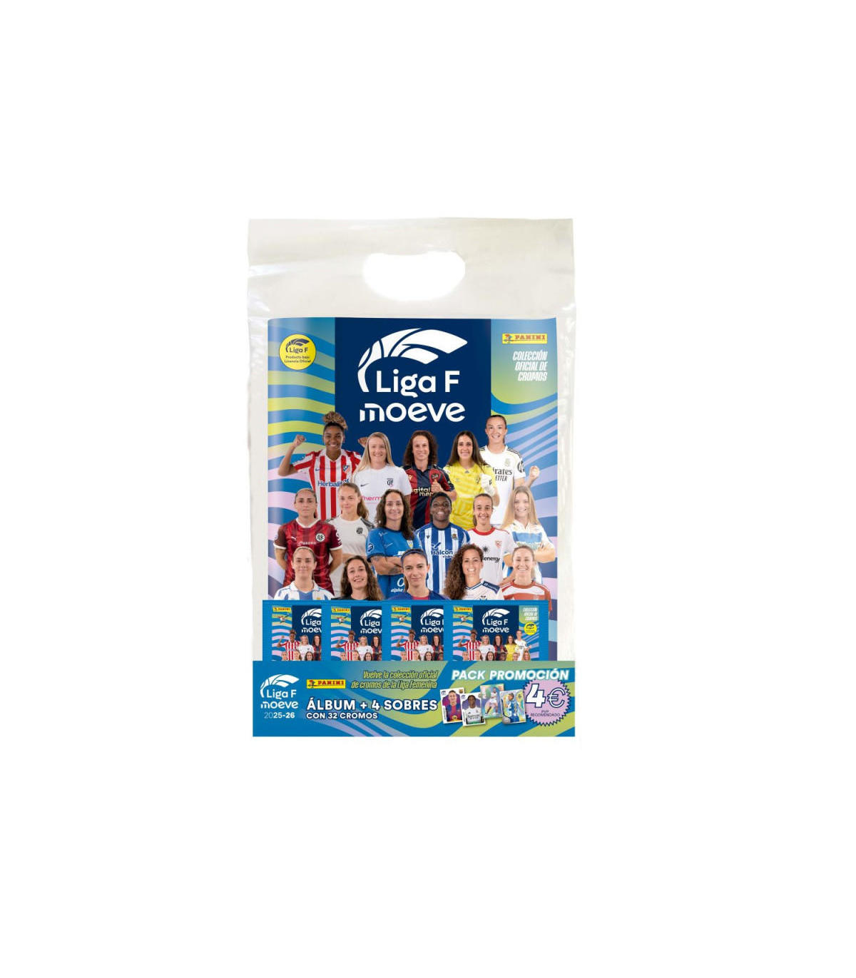 Bolsa con un álbum y 4 sobres de cromos de la Liga Femenina 2025/2026.