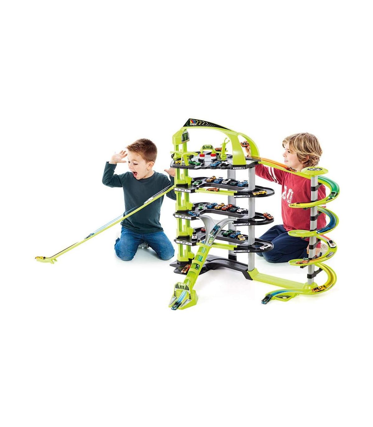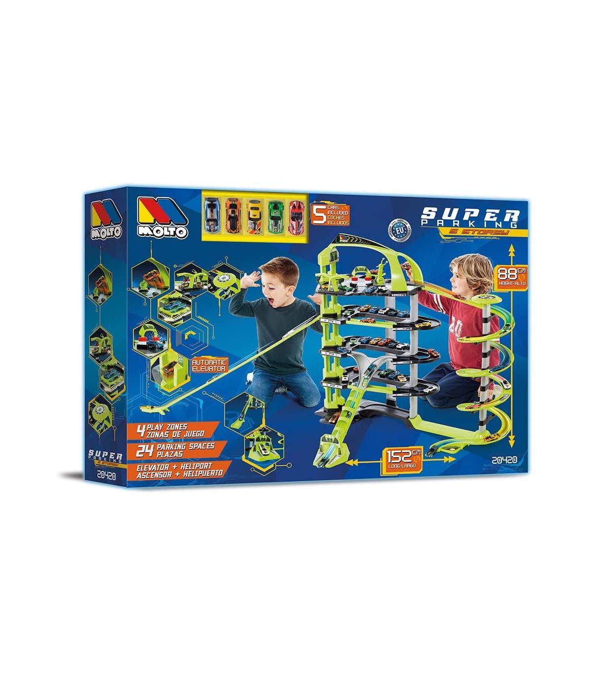Súper Garaje con 5 plantas de Moltó con 4 zonas de juego, 24 plazas de parking y gran cantidad de rampas y espacio de juego, ascensor automático, helipuerto y 5 coches incluidos. Baja a toda velocidad por sus rampas imposibles, lava tu coche repáralo y vuelve a lanzarte de nuevo. Sus curvas imposibles y su empinada rampa te dejarán con la boca abierta.