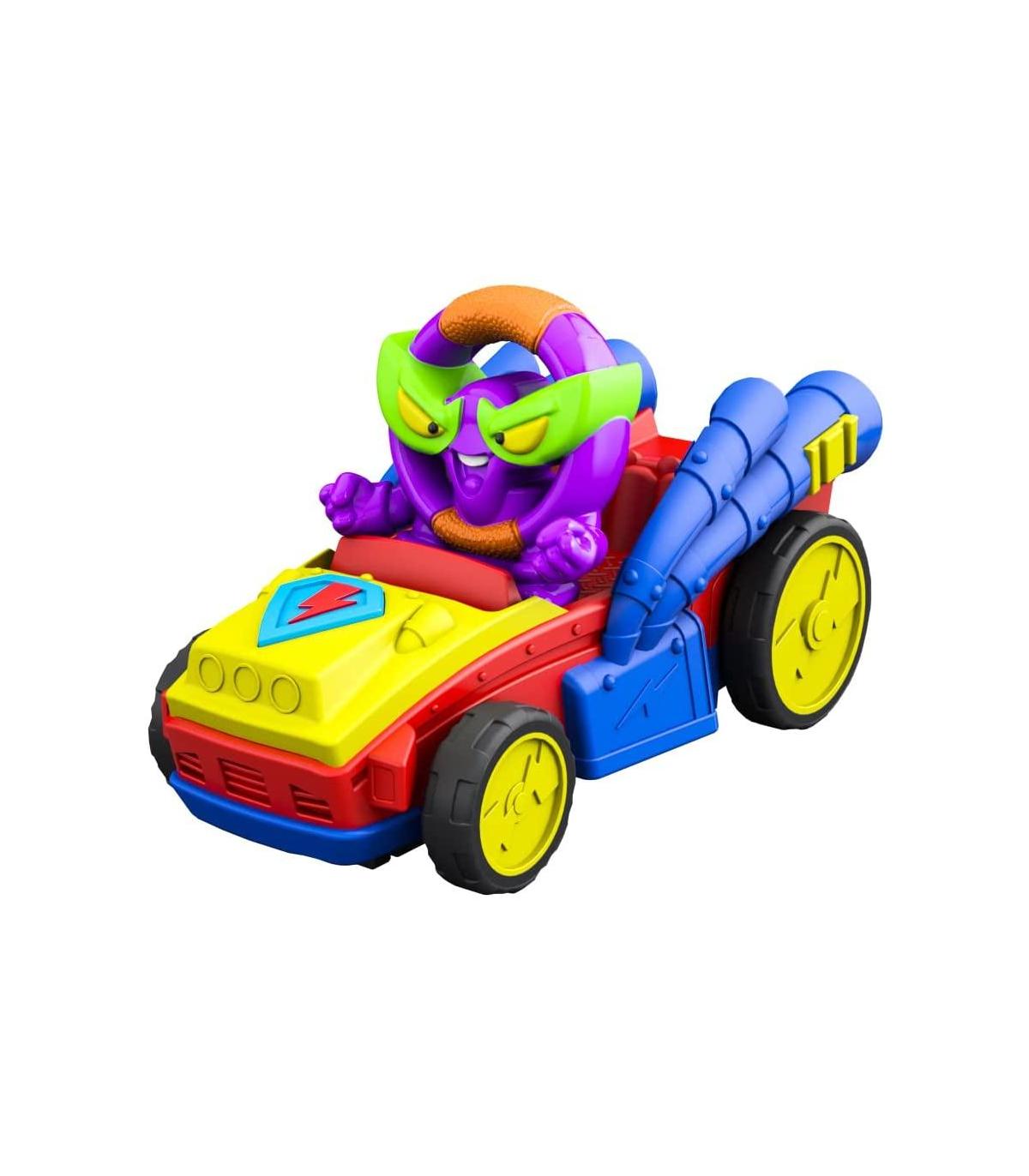 Incluye dos coches y dos figuras de Superthings: Helmut Speed y Wheelzag, un héroe y un villano ¿quién ganará la carrera?