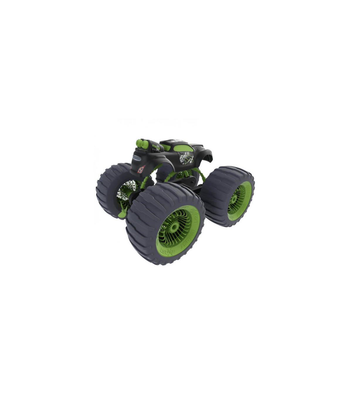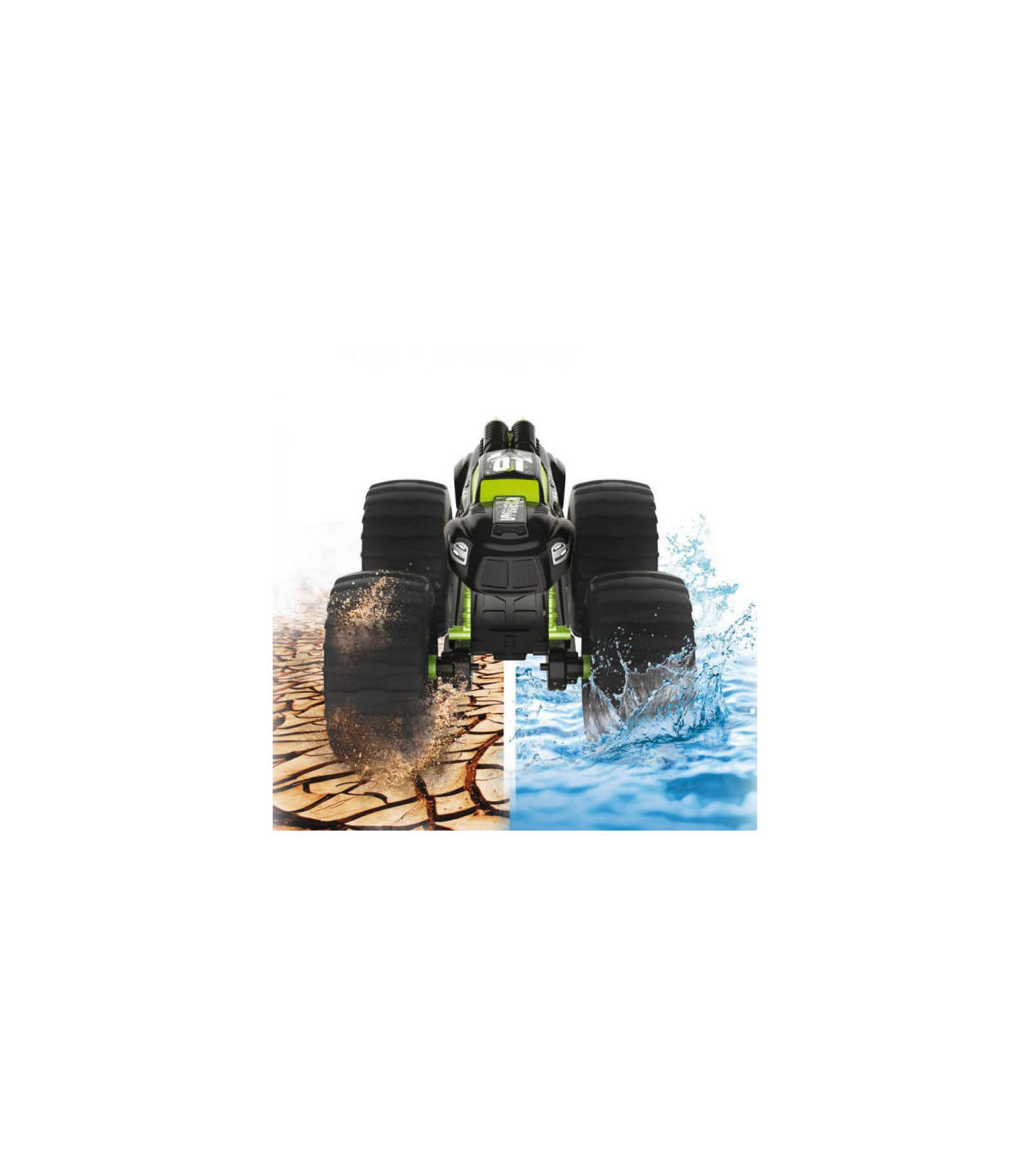 Fantástico vehículo todoterreno que arrasa en tierra y desafía las olas. Es súper rápido con una velocidad máxima que alcanza los 10 km por hora y resiste el 100% de los golpes gracias a sus súper ruedas. Haz infinidad de acrobacias aprovechando su ligereza y la gran maniobrabilidad. Con potente turbina doble. ¡Va el doble de rápido por agua! Con protección especial impermeable del vehículo y neumáticos de gran adherencia que permite su flotabilidad. Con transmisión de 2,4GHZ.