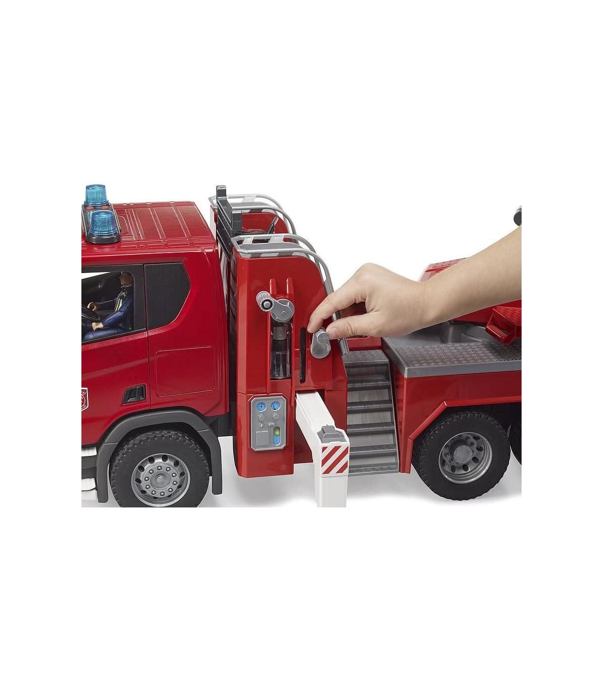 El camión de bomberos Scania Super 560R con escalera giratoria y bomba de agua viene con un módulo de luz y sonido instalado