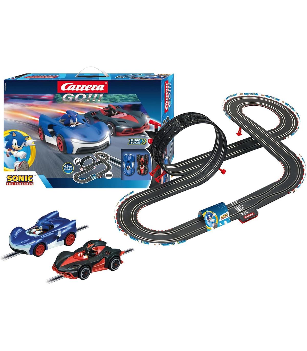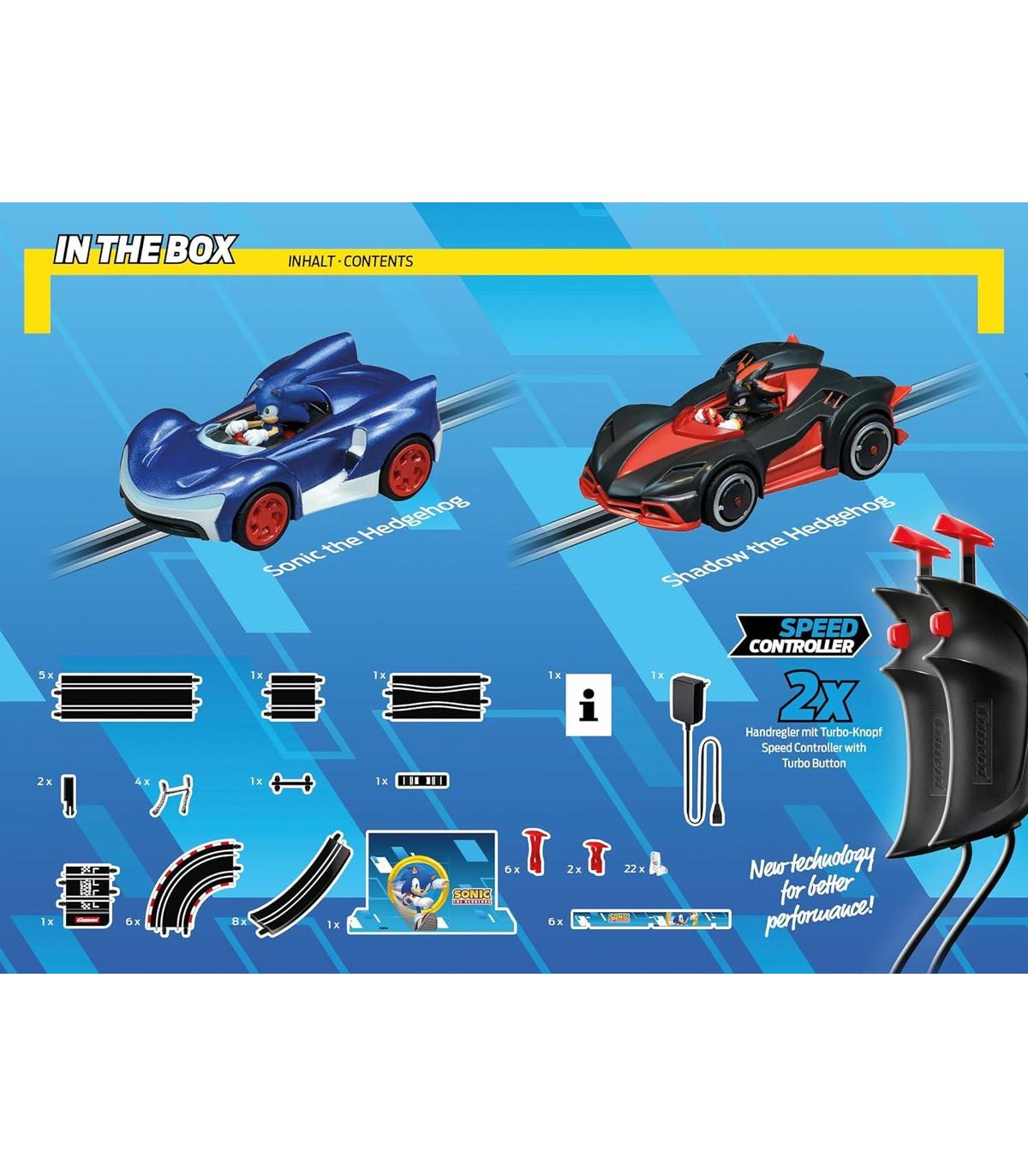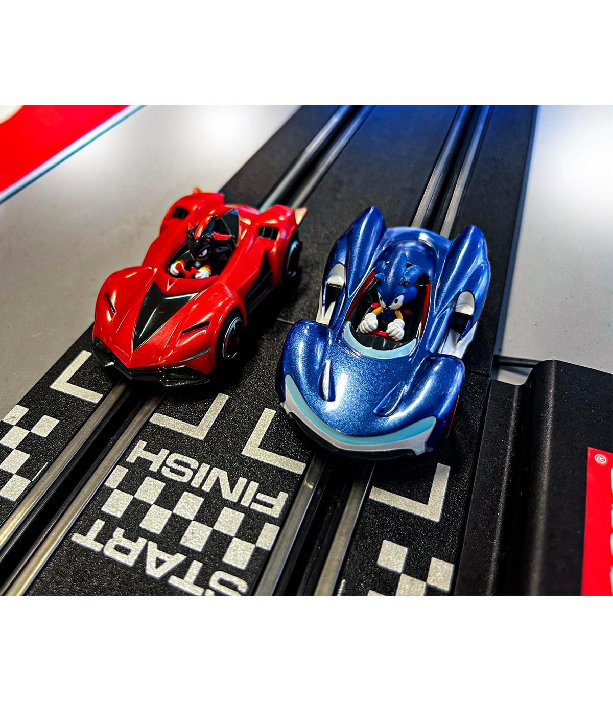 Sonic (sonic+shadow) 4,9 M Circuito de 4,9m (montado 150x92cm) Incluye dos coches de Sonic: Sonic+Shadow, chicane, puente, y looping. Mandos con función Turbo. Elementos decorativos.