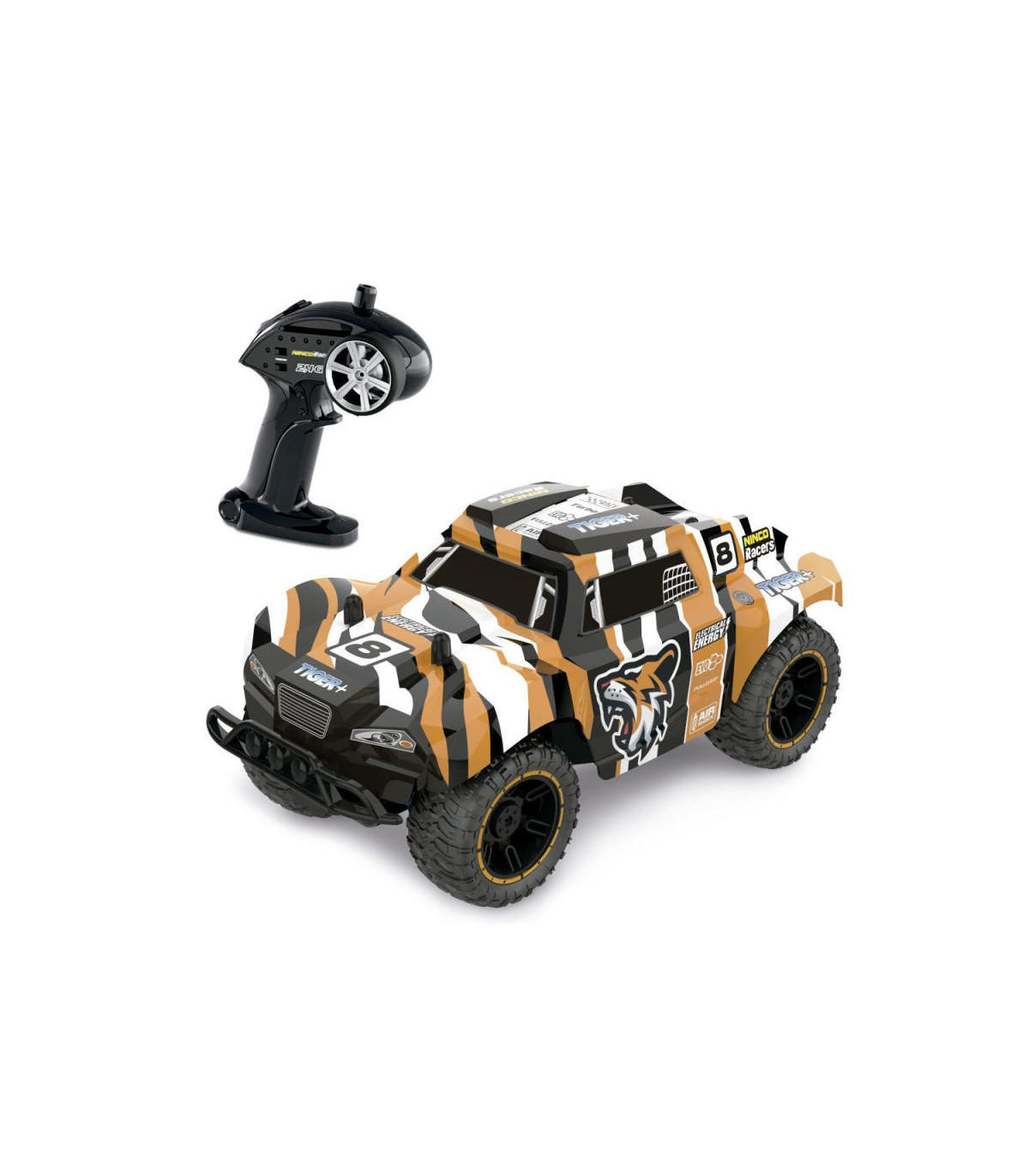 Monster Truck RC TIGER+ con gran capacidad de giro y emisora de 2.4Ghz para jugar en grupo sin interferencias; suspensión en las 4 ruedas. Aceleración progresiva. Escala 1/18; velocidad 15Km/h